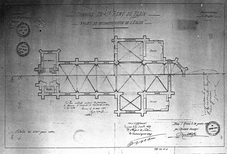 COMMUNE DE St REMY-DU-PLEIN PROJET DE RECONSTRUCTION DE L'EGLISE, Plan au sol. Dessin, par Albert Béziers la Fosse Fils, architecte, 1873. (A.D. Ille-et-Vilaine).
