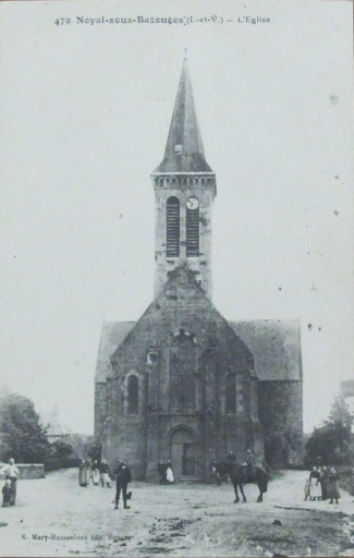 L'église actuelle dédiée à saint Martin a été construite de 1855 à 1856 sur l'emplacement d'une ancienne église romane, remaniée aux 15e et 16e siècles, qui menaçait ruine. Cette ancienne église était orientée à l'est comme le veut la tradition chrétienne alors que la nouvelle église a le chœur orienté au sud. En orientant ainsi l'édifice, son entrée est directement visible pour le visiteur qui entre dans le village en provenance de Bazouges-la-Pérouse. Ce choix a sans conteste donné une nouvelle physionomie au village et mis en valeur le nouvel édifice. A la demande du recteur de Noyal-sous-Bazouges, un procès verbal dressé en 1840 par l'architecte Anger de la Loriais, élève de l’École Royale des beaux-arts, rend compte de l'état de l'église. Celle-ci est construite en moellons de granite. Elle est couverte de bardeaux et surmontée d'une flèche en bois couverte en ardoise ainsi que d'un clocheton couvert en ardoise. L'état général de l'église est d'une grande vétuste et menace ruine. Le procès verbal décrit une façade occidentale "dégradée", une façade sud "dans un état de vétusté" et dont "plusieurs pierres de la corniche se sont déjà détachées". La façade nord est quant à elle "dégradée par l'humidité parce qu'elle est peu enterrée". L'état intérieur complète cette description : la voûte de la nef en bois est "entièrement pourrie" et menace "d'une ruine imminente", les dix poteaux en bois qui la soutiennent étant "en fort mauvais état" ou "entièrement vermoulus". Les voûtes du chœur et de la sacristie semblent en meilleur état. La couverture, le clocheton et le clocher menacent ruine. La conclusion de ce procès verbal précise que " l'église, dans l'état où elle se trouve, menace ruine, qu'elle compromet la vie des habitants et qu'une réparation même partielle serait inutile, insuffisante et même dangereuse. En conséquence, [...] il est urgent de démolir la dite église de Noyal-sous-Bazouges dans toutes ses parties et de la rebâtir sur de nouveaux plans." L'église actuelle a ainsi été construite de 1855 à 1856, sur les plans de l'architecte Jean-Marie Anger de La Loriais, qui avait fait le procès verbal 15 ans plus tôt et l'auteur également de la Maison d'école et mairie, construite en 1850. Ce dernier a réemployé pour la nouvelle église quelques éléments de l'ancien édifice, comme les portails du transept datables du 15e siècle. Hormis la chaire à prêcher qui date de 1858 et dont l'auteur est Julien Viard de Combourg, l'ensemble du mobilier de l'église a été exécuté par le menuisier rennais Jean-Julien Hérault. Il est composé de deux autels latéraux (1862), d'un confessionnal (1864), d'un maître-autel (1870 ou 1872) et de stalles (1876). La sacristie est construite en 1865 au dos du chœur. En 1923, suite à de grosses intempéries, une partie du pignon sud-ouest s'est effondrée. Des travaux de rénovation sont alors entrepris. De 1981 à 1983, l'église est fermée pour travaux. Un fort écartement des murs de la nef vers l'extérieur rend indispensable sa restauration.