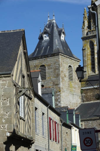 L'église de Bazouges-la-Pérouse se présente comme un vaste édifice orienté à l'ouest, dépourvu de transept. Cet édifice possède trois vaisseaux : un vaisseau central aveugle avec une élévation sur deux niveaux, couvert longitudinalement par une voûte en berceau brisé. Précédée, à l'est, par un porche qui supporte le clocher, cette nef se termine, à l'ouest, par un chevet à pans coupés et éclairage direct sur deux niveaux. Deux bas-côtés, voûtés identiquement d'un berceau brisé flanquent la nef centrale. Tous deux sont prolongés, à l'ouest, par une sacristie. La tour de l'horloge, anciennement clocher de l'église, s'élève en la partie centrale du bas côté sud. L'église se compose d'une nef centrale beaucoup plus haute que ses collatéraux, séparée de chacun d'eux par une série d'arcades plus ou moins brisées. Côté nord, on trouve cinq arcades qui retombent sur des piles ou des demi-piles à section polygonale, possédant bases et chapiteaux moulurés. Côté sud, il n'y a que quatre arcades légèrement plus évasées que celles qui leur font face. Elles reposent toutes sur des piles cylindriques, sauf l'arcade la plus à l'est, celle qui conduit sous la tour de l'horloge, dont les retombées se font sur deux énormes massifs de colonnes aux formes pour le moins irrégulières. Pour son édification on employa deux matériaux locaux : le granite et accessoirement le schiste pour le gros œuvre, et pour la couverture l'ardoise. L'église de Bazouges-la-Pérouse est orientée à l'ouest contrairement à la tradition mais conformément aux impératifs locaux. Occupant toute la partie nord d'une place, l'église a été construite isolément. A l'est, l'église est bordée par l'axe principal de la ville, l'allée menant au cimetière limite l'église au nord. C'est entre le mur de clôture du chevet et le cimetière qui occupe toute une zone située à l'ouest de l'église, que l'on a construit l'actuel presbytère, à l'endroit où s'élevait autrefois l'ancien prieuré. Cette construction est un bâtiment rectangulaire à un étage, précédé d'une cour. La principale entrée se situe sur la façade orientale où l'on a une grande porte centrale encadrée par deux portes plus petites. L'escalier de neuf marches qui s'y trouve conduit sous un porche, aménagé sous l'actuel clocher, à partir duquel on peut entrer dans la nef. Il existe une autre ouverture placée cette fois-ci au sud, sous le porche précédant la tour de l'horloge. Cette porte qui donne accès au bas-côté méridional de l'église est précédée de trois marches. L'église est donc construite sur un terrain à forte dénivellation d'ouest en est. On peut enfin pénétrer dans l'église en empruntant les deux sacristies placées dans le prolongement occidental de chacun des bas-côtés. C'est au nord-est de la tour de l'horloge que s'élève l'actuel clocher, juste au-dessus de l'extrémité orientale de la nef. Reposant sur une base granitique, la flèche fut, elle aussi, entièrement construite en granite.
