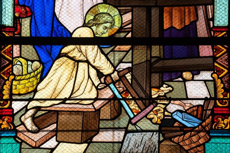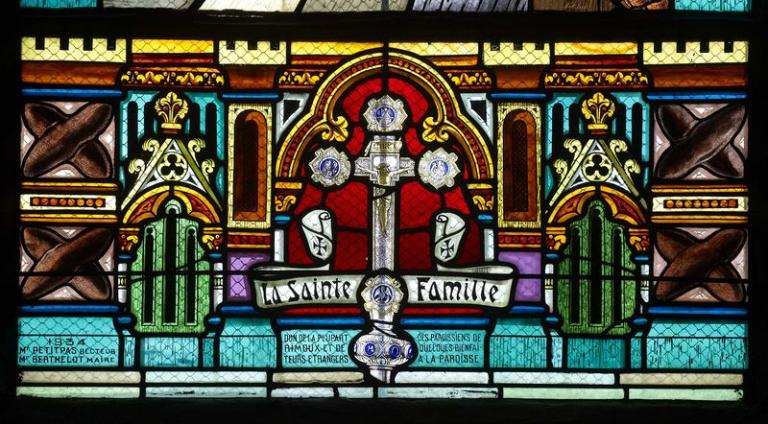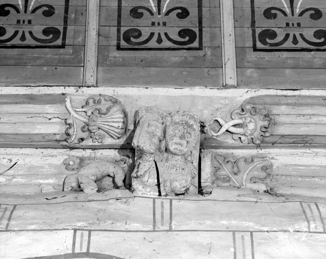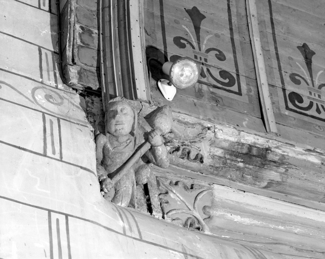 Personnages profanes sculptés, support : sablières ; ostensoir avec inscription : JE SUIS LE PAIN DE VIE entouré de deux anges, support : peinture du lambris.