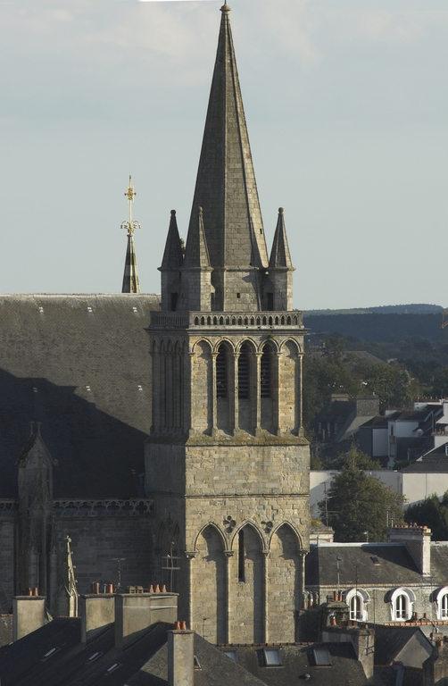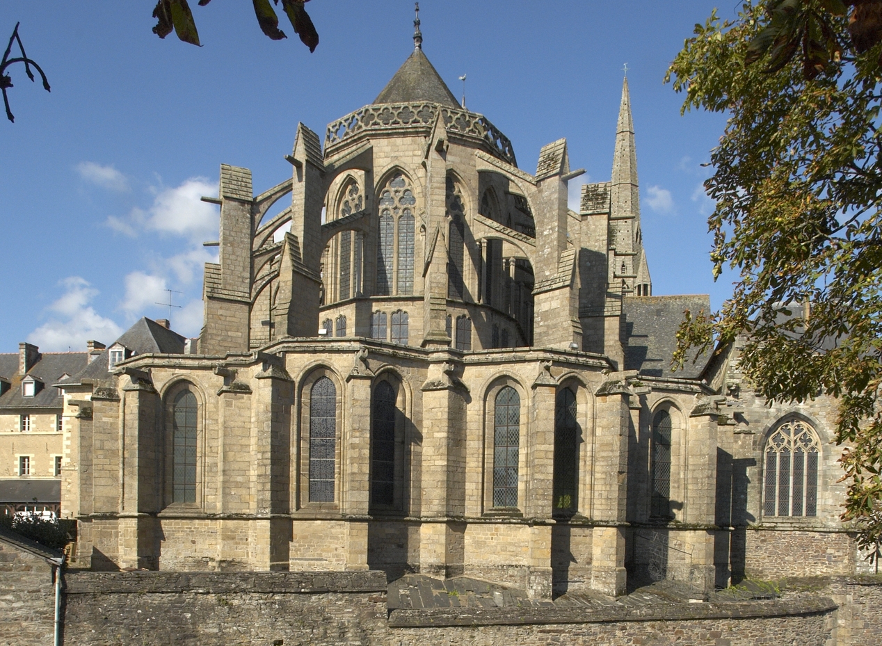 L’époque romane n’a laissé en Bretagne qu’un nombre infime d’édifices entièrement voûtés. Les deux plus importants, exceptionnels par leur parti ou leur mode de couvrement, n’ont pas fait école. Construite autour de 1100, l’église abbatiale Sainte-Croix de Quimperlé, par son plan en rotonde, fait figure d’unicum. La travée centrale, tenant lieu de carré du transept, est couverte d’une coupole sur pendentifs soutenue par deux larges arcs diagonaux retombant sur quatre piliers massifs et formant une pseudo-croisée d’ogives. Quant à la nef de la cathédrale de Nantes, édifiée par l’évêque Brice après 1118, elle était couverte d’une file de coupoles, à l’imitation de la cathédrale d’Angoulême ou de l’église de Fontevrault. Les autres sont de dimensions modestes, et situés aux marches de la Bretagne, comme la chapelle de la Madeleine de Clisson, élevée par les Templiers à la fin du XIIe siècle. Ces prémices ont certainement joué un rôle important dans l’attachement constant, pendant toute la période gothique et bien au-delà, au principe du couvrement en bois. Certes, les cathédrales bretonnes ont toutes été conçues d’emblée pour recevoir des voûtes en pierre, mais celles-ci ne furent pas toujours mises en œuvre immédiatement, loin s’en faut, l’installation de la charpente assurant la mise hors d’eau de l’édifice et son ouverture au culte. À Quimper, le chœur, commencé vers 1240, dut attendre les années 1410 pour être voûté. De même, la nef de Saint-Pol-de-Léon, élevée dans la seconde moitié du XIIIe siècle, n’en sera dotée que sous l’épiscopat de Guillaume (1349-1385), et les bras du transept, initialement pourvus d’une charpente lambrissée, seulement dans la première moitié du XVIe siècle. À Vannes, le vaisseau unique de la nef, bâti dans le troisième quart du XVe siècle, même si les relevés anciens laissent voir des départs de voûtes, resta finalement charpenté et ne reçut un lambris de couvrement qu’en 1626, les lourdes voûtes d’arêtes actuelles ne datant que de 1768. À Rennes, un expert observe en 1751 que “ les murs latéraux des branches de la croix de l’églize, ainsi que ceux des croupes ou du pignon, ne sont pas de même construction [que la croisée] ; ces murs étoient destinés pour porter des voûtes d’ogives qui n’ont point été exécutées ”. Cette réticence à l’égard du voûtement était, au moins pour partie, imposée par la géologie. Si la Bretagne ne se résume pas, comme l’imagerie folklorique tendrait à le faire croire, à son substrat granitique – les bâtisseurs ayant notamment exploité les schistes et les grès armoricains –, le granite représente néanmoins une part importante de ses ressources pétrographiques. Or, sa masse volumique varie entre 2580 kg/m3 pour la pierre de Locronan à 2700 kg/m3 pour celle de Louvigné-du-Désert, alors que celle du tuffeau d’Anjou et de Touraine est presque deux fois moindre (entre 1350 et 1530 kg/m3). Et cette densité est encore sensiblement supérieure à celle de la pierre de Caen (entre 1840 et 2220 kg/m3).
