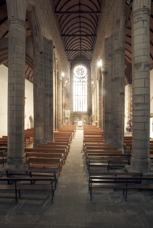 À l’extrémité occidentale du duché, l’important groupe de Pont-Croix adopte dès le XIIIe siècle ce parti architectural : la collégiale Notre-Dame de Roscudon, dont la construction est entreprise vers le milieu du siècle, présente une nef à collatéraux et, cas unique en Bretagne, un chœur à doubles collatéraux, éclairés tous deux par des fenêtres basses percées dans les murs gouttereaux. La nef de l’abbatiale de Saint-Mathieu-de-Fineterre, reconstruite peu après 1300 et prévue dans un premier temps comme le nouveau chœur, avec des fenêtres hautes très développées, reprend finalement le parti à nef obscure, déjà employé pour l’édifice roman si l’on en croit la silhouette du pignon ouest dépourvu de décrochement, datable des années 1170-1180, et qui est alors conservé avec les deux premières travées de la nef. L’exemple du changement de parti opéré pour la nef de Saint-Mathieu est représentatif d’une tendance générale qui se fait jour au XIVe siècle pour s’affirmer au XVe et perdurer au XVIe siècle : celle de l’édifice à nef obscure. L’innombrable famille d’églises et de chapelles bretonnes construites sur ce principe transforme plutôt en exceptions les édifices à trois vaisseaux pourvus de fenêtres hautes comme l’église de La Roche-Derrien, au XIVe siècle, ou les chœurs de Guingamp et de Saint-Malo de Dinan à la fin du XVe. L’important développement des collatéraux, dans lesquels s’installent les fondations des confréries ou des riches particuliers, peut aussi entraîner l’occultation des fenêtres hautes, comme à la chapelle du Kreisker à Saint-Pol-de-Léon, lors de la reconstruction des chapelles latérales de la nef, coiffées de hauts pignons.