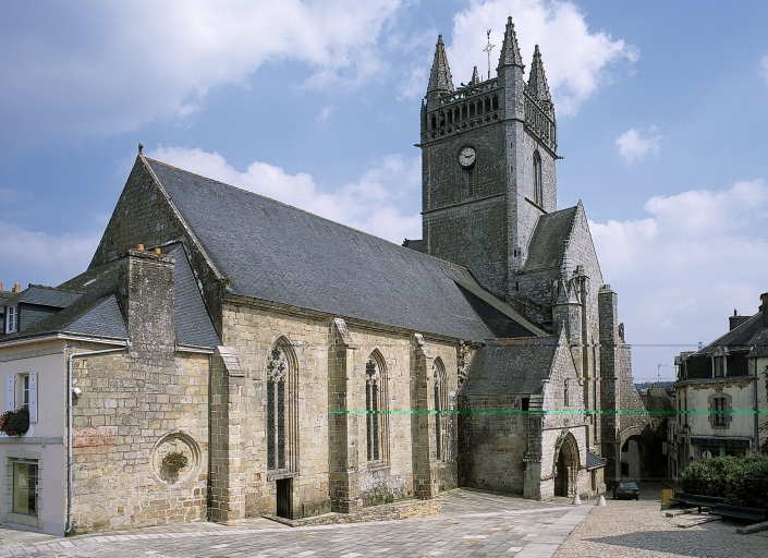 Les grandes églises urbaines édifiées à la fin du XVe siècle traduisent cette orientation vers un espace unifié. La largeur de leurs nefs, couvertes de charpentes lambrissées, n’est plus limitée par la question du voûtement et leurs collatéraux desservent des files de chapelles qui répartissent par travées, de façon homogène et unificatrice, au nord et au sud, les différentes fondations de corporations, de riches bourgeois ou de familles nobles. Ainsi émerge, dans le contexte du développement des villes bretonnes à la fin du Moyen Âge, une nouvelle forme d’église dont l’espace intérieur unifié intègre de façon discrète et périphérique les vestiges de l’ancienne société. La grande église Saint-Nonna de Penmarc’h, reconstruite vers 1500, illustration de l’émergence d’une classe nouvelle enrichie par le commerce de mer, présente ce nouveau parti : malgré le maintien de l’arc transversal permettant l’accroche du jubé, les traces d’une clôture de chœur et les enfeus nobiliaires installés le long des bas-côtés dans l’allège des fenêtres, son vaste volume de proportions et de style unitaire entre la nef et le chœur participe de l’esthétique nouvelle. Les églises du Croisic, de Saint-Sulpice et de Saint-Léonard à Fougères, de Saint-Jean à Lamballe, de Saint-Jean-du-Baly à Lannion et de Saint-Melaine à Morlaix adoptent ce nouveau parti, que développe de façon originale Saint-Armel de Ploërmel, église-halle où la solide charpente lambrissée du vaisseau central et les fausses voûtes en bois des collatéraux permettent d’amoindrir au maximum la section des piles pour dégager et unifier l’espace intérieur. À Notre-Dame-de-Paradis d’Hennebont, le grand vaisseau central à quatre travées égales et piles identiques ne présente aucune trace d’une quelconque séparation entre nef et chœur. Les deux portails latéraux ouverts en vis-à-vis, au nord et au sud, au niveau de la troisième travée, ne correspondent à aucun transept et ne sont là que pour faciliter l’entrée et la sortie des fidèles les jours d’affluence. Cette unification de l’espace intérieur s’impose à la dernière génération du gothique breton : les vastes églises paroissiales reconstruites en Léon ou en Cornouaille au cours de la première moitié du XVIe siècle en adopteront le modèle.