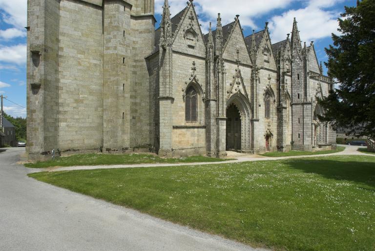 Au Folgoët, chantier bien-aimé des ducs Jean IV et Jean V, l’imposante chapelle greffée en retour d’équerre au sud du chœur bouleverse le projet originel de l’édifice. Le porche monumental, habituellement plaqué contre les nefs, qui lui donne accès par l’ouest est ici surchargé de l’emblématique ducale signalant clairement l’entrée d’un espace réservé. La sacristie qui lui est accolée, surmontée d’un oratoire chauffé, équipé de latrines, avec regard de surveillance orienté vers le porche, confirme bien que toute cette partie de la basilique est destinée à l’usage du prince et de ses proches. La chapelle de Notre-Dame-de-la Cour à Lantic présente un bras de croix unique au sud ouvrant par deux arcades sur le chœur, qui reprend dans une version simplifiée ce principe, comme Notre-Dame d’Avaugour en Saint-Péver, où la chapelle sud était d’ailleurs appelée « chapelle du baron ».