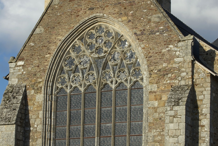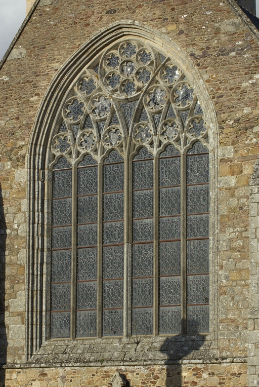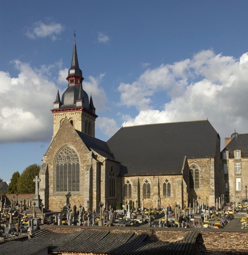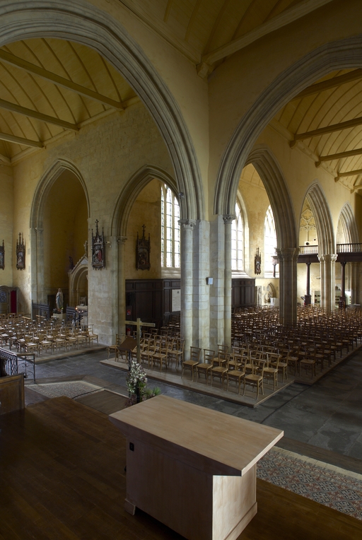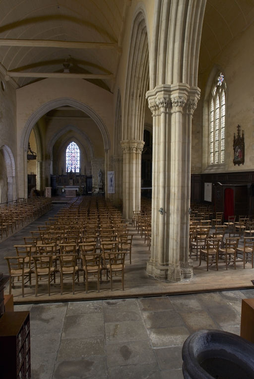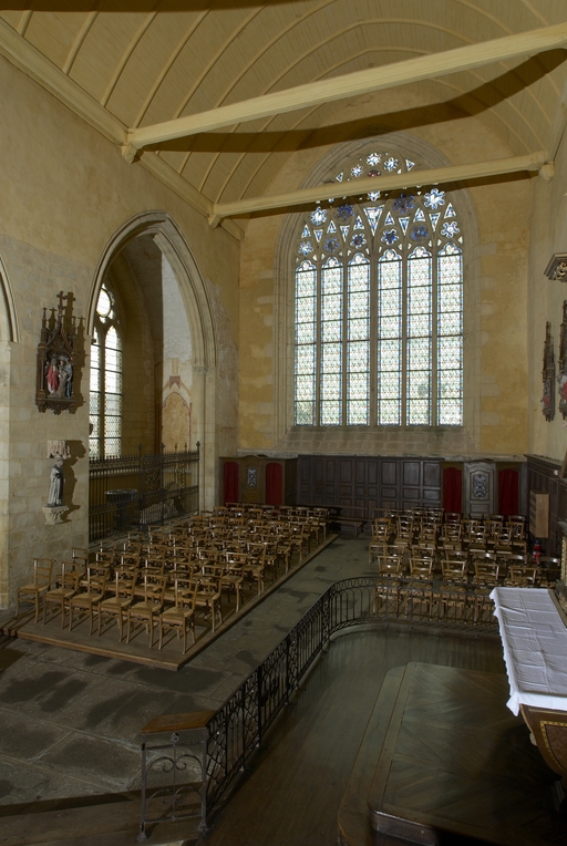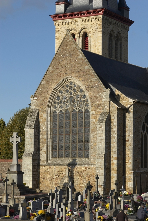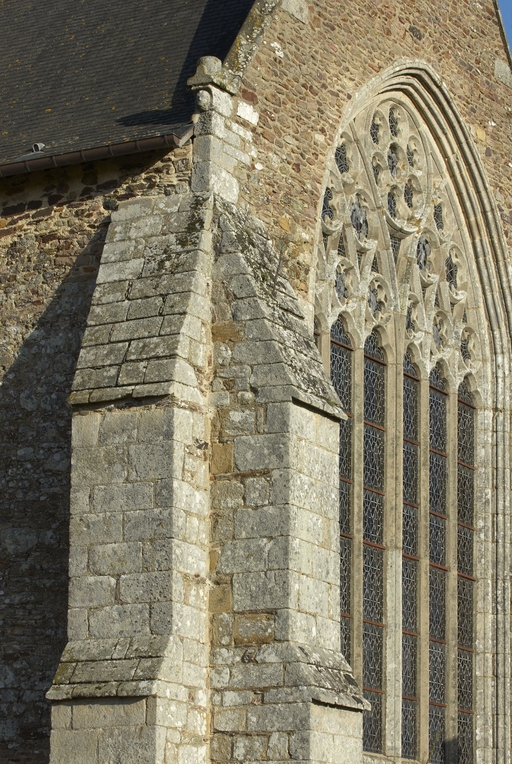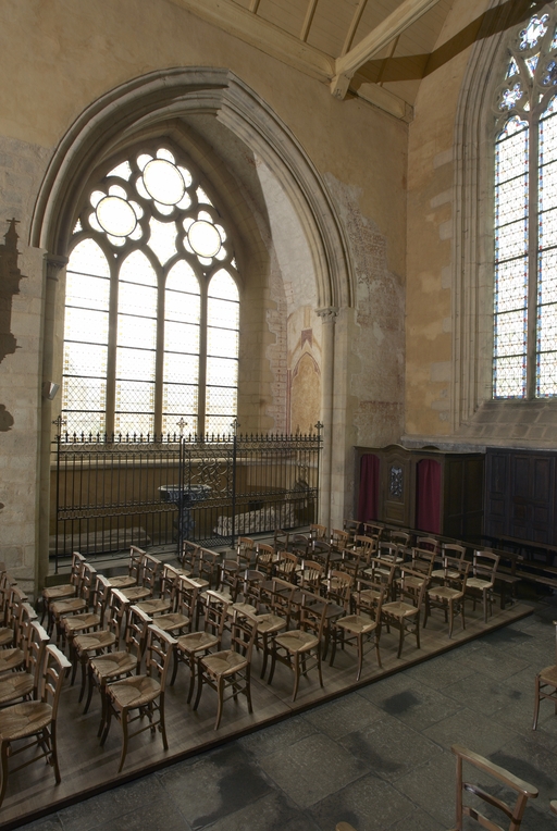 Le vaste transept, long de 35,50 m dans-œuvre, présente une disposition originale à chapelles orientées peu profondes, de plan rectangulaire, qui rappelle les plans cisterciens, l'une au sud dédiée au Saint-Esprit et l'autre au nord à Notre-Dame de Bon Secours. Le carré de la croisée ne sert qu'à délimiter l'espace intérieur de l'édifice et, curieusement, l'arc triomphal marquant l'entrée du chœur s'interrompt bien avant le lambris de couvrement du chœur qui file de manière continue depuis le mur du chevet jusqu'à celui de la tour à l'ouest. Le vaste transept largement débordant et dont les bras sont presque aussi longs que le chœur est rigoureusement scandé sur toute sa longueur, du nord vers le sud, par une série de cinq arcades que recroise au milieu deux autres arcades d'est en ouest délimitant la croisée. Comme le montre bien le décalage important du raccord du transept avec la tour du côté nord, ce nouveau chœur est sensiblement plus large que l'ancien ; il n'est pas voûté mais couvert d'un lambris en berceau brisé. L'architecture très particulière de ce transept est scandée de demi-colonnes adossées à des massifs aux arêtes chanfreinées Curieusement et de façon plutôt inhabituelle, le rouleau externe des arcs puissamment moulurés retombe non sur une colonnette mais sur les extrémités des murs : ce détail qui confère à l’ordonnance une élégance austère rappelle l'église de l'abbaye de Beauport. A la croisée, l'absence de colonnettes dans l'angle rentrant des piles est naturellement liée ici à l'absence de voûtement. Cette transcription épurée des formules du gothique classique met l'accent sur la vigueur de la mouluration des arcs qui font alterner de larges tores et de profonds cavets. Les beaux chapiteaux à crochets parfaitement dessinés ainsi que les bases retrouvées lors de sondages archéologiques, malheureusement de nouveau enfouies depuis, qui ont révélé des galettes débordantes et des lignes de perles semblables à celles que l’on trouve dans le chœur de Saint-Sauveur de Redon, appartiennent pleinement au gothique classique et orientent vers une datation du dernier tiers du XIIIe siècle. Le réseau de l'importante et haute verrière qui s'ouvre généreusement dans le bras sud, bien au-delà de la base du pignon, est constitué de deux larges arcatures géminées dont les trois lancettes sommées d'arcs aigus se recroisent à leur sommet. Ces arcs recroisés, fréquents dans le milieu anglo-normand, que l'on retrouve sur les baies du collatéral nord du chœur, étaient également visible jusqu'au milieu du XIXe siècle dans une baie du mur ouest du bras sud, murée depuis. Dans la grande baie du bras sud, les formes ainsi déterminées sont remplies de rosaces à six ou cinq lobes, et le sommet occupé par une rose elle-même composée de sept petites roses à six lobes. Parmi les fragments de vitraux conservés, le rondel central au sommet de la baie présente un écu échiqueté d’or et d’azur à la bordure de gueules, brisé d'un franc quartier d’hermine, armes utilisées par les ducs de Bretagne depuis Pierre de Dreux, baillistre de Bretagne entre 1213 et 1237 et jusqu’en 1316, date à laquelle Jean III adopte l’écu d’hermine plein, date qui donne donc pour le transept un terminus ad quem. Il faut probablement attribuer cette campagne de construction à Jean II, duc de 1286 à1305, époux de Béatrice, fille du roi d'Angleterre Henri III.Le collatéral nord du chœur, que les actes anciens appellent “ chapelle de Saint-Florent et de Saint-Méen ” en souvenir du transfert des reliques de saint Méen à l'abbaye de Saint-Florent de Saumur au IXe siècle, double littéralement le chœur. De même hauteur que le vaisseau principal, par ses larges et hautes baies percées dans le mur nord et les larges arcades qui l'en séparent, il supplée au côté sud presque complètement aveugle. D'un style radicalement différent de celui du transept, ce collatéral nord a été reconstruit dans la première moitié du XIVe siècle. Les chapiteaux à feuillages souples et gonflés rappellent ceux du chœur de Dol et de Saint-Suliac. Les bases prismatiques à ressauts, les baies à lancettes aiguës qui se recoupent ont des accents anglo-saxons que l'on retrouve à la même époque à Notre-Dame de Lamballe. Le style tellement particulier de ces arcades, leurs bases à galette saillante sur une masse à pans coupés moulurée en talon, leurs chapiteaux à corbeille étirée que surmonte un tailloir à plusieurs ressauts pourraient sans difficulté passer pour l’œuvre d'un maître d'outre-Manche. Le tailloir qui touche la croisée, orné de serpents entrelacés rappelant de façon troublante les enluminures carolingiennes, fait sans doute aussi allusion à la légende de saint Méen auquel on attribuait d'avoir chassé des environs d'Angers un serpent monstrueux. Au fond, dans le mur du chevet, l'ancienne baie du collatéral, mise au jour lors de la récente restauration, présente un réseau anguleux à base de trilobes et de quadrilobes qui, avec les larges baies à dessin recroisé percées dans le mur nord, permettent de situer la reconstruction de cette partie de l'église au cours de la première moitié du XIVe siècle.