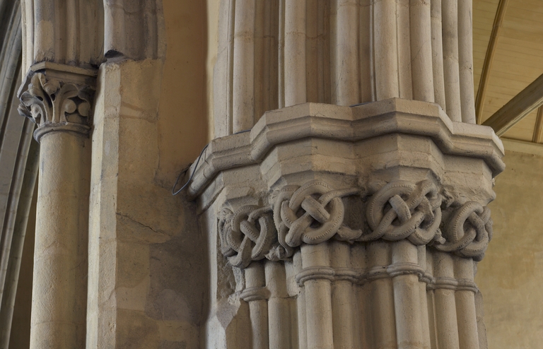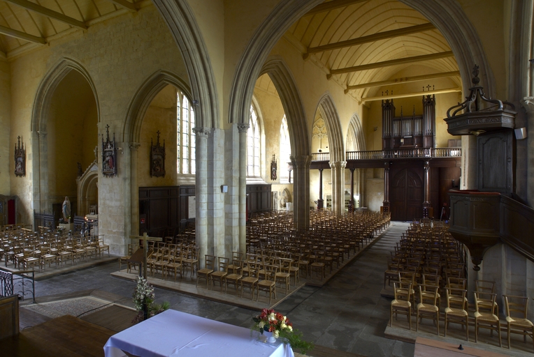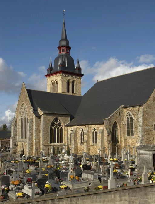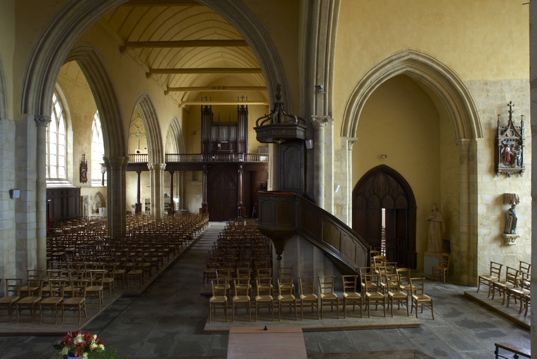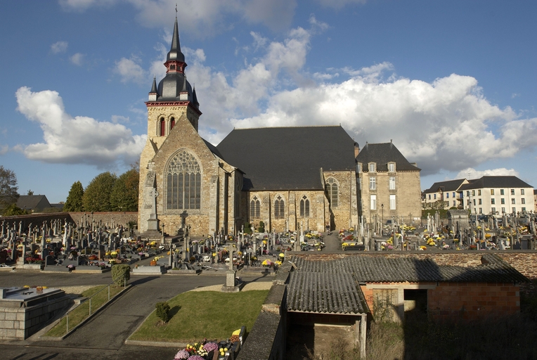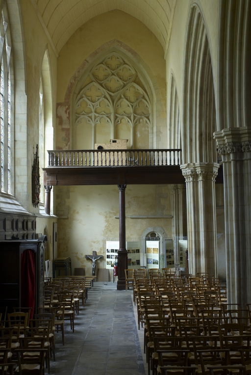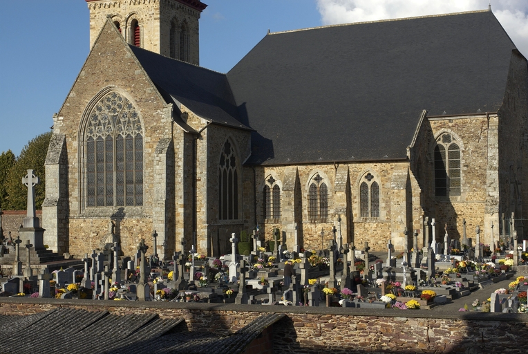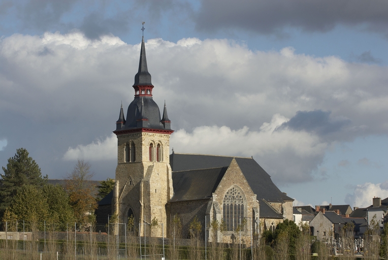 Le vaste transept, long de 35,50 m dans-œuvre, présente une disposition originale à chapelles orientées peu profondes, de plan rectangulaire, qui rappelle les plans cisterciens, l'une au sud dédiée au Saint-Esprit et l'autre au nord à Notre-Dame de Bon Secours. Le carré de la croisée ne sert qu'à délimiter l'espace intérieur de l'édifice et, curieusement, l'arc triomphal marquant l'entrée du chœur s'interrompt bien avant le lambris de couvrement du chœur qui file de manière continue depuis le mur du chevet jusqu'à celui de la tour à l'ouest. Le vaste transept largement débordant et dont les bras sont presque aussi longs que le chœur est rigoureusement scandé sur toute sa longueur, du nord vers le sud, par une série de cinq arcades que recroise au milieu deux autres arcades d'est en ouest délimitant la croisée. Comme le montre bien le décalage important du raccord du transept avec la tour du côté nord, ce nouveau chœur est sensiblement plus large que l'ancien ; il n'est pas voûté mais couvert d'un lambris en berceau brisé. L'architecture très particulière de ce transept est scandée de demi-colonnes adossées à des massifs aux arêtes chanfreinées Curieusement et de façon plutôt inhabituelle, le rouleau externe des arcs puissamment moulurés retombe non sur une colonnette mais sur les extrémités des murs : ce détail qui confère à l’ordonnance une élégance austère rappelle l'église de l'abbaye de Beauport. A la croisée, l'absence de colonnettes dans l'angle rentrant des piles est naturellement liée ici à l'absence de voûtement. Cette transcription épurée des formules du gothique classique met l'accent sur la vigueur de la mouluration des arcs qui font alterner de larges tores et de profonds cavets. Les beaux chapiteaux à crochets parfaitement dessinés ainsi que les bases retrouvées lors de sondages archéologiques, malheureusement de nouveau enfouies depuis, qui ont révélé des galettes débordantes et des lignes de perles semblables à celles que l’on trouve dans le chœur de Saint-Sauveur de Redon, appartiennent pleinement au gothique classique et orientent vers une datation du dernier tiers du XIIIe siècle. Le réseau de l'importante et haute verrière qui s'ouvre généreusement dans le bras sud, bien au-delà de la base du pignon, est constitué de deux larges arcatures géminées dont les trois lancettes sommées d'arcs aigus se recroisent à leur sommet. Ces arcs recroisés, fréquents dans le milieu anglo-normand, que l'on retrouve sur les baies du collatéral nord du chœur, étaient également visible jusqu'au milieu du XIXe siècle dans une baie du mur ouest du bras sud, murée depuis. Dans la grande baie du bras sud, les formes ainsi déterminées sont remplies de rosaces à six ou cinq lobes, et le sommet occupé par une rose elle-même composée de sept petites roses à six lobes. Parmi les fragments de vitraux conservés, le rondel central au sommet de la baie présente un écu échiqueté d’or et d’azur à la bordure de gueules, brisé d'un franc quartier d’hermine, armes utilisées par les ducs de Bretagne depuis Pierre de Dreux, baillistre de Bretagne entre 1213 et 1237 et jusqu’en 1316, date à laquelle Jean III adopte l’écu d’hermine plein, date qui donne donc pour le transept un terminus ad quem. Il faut probablement attribuer cette campagne de construction à Jean II, duc de 1286 à1305, époux de Béatrice, fille du roi d'Angleterre Henri III.Le collatéral nord du chœur, que les actes anciens appellent “ chapelle de Saint-Florent et de Saint-Méen ” en souvenir du transfert des reliques de saint Méen à l'abbaye de Saint-Florent de Saumur au IXe siècle, double littéralement le chœur. De même hauteur que le vaisseau principal, par ses larges et hautes baies percées dans le mur nord et les larges arcades qui l'en séparent, il supplée au côté sud presque complètement aveugle. D'un style radicalement différent de celui du transept, ce collatéral nord a été reconstruit dans la première moitié du XIVe siècle. Les chapiteaux à feuillages souples et gonflés rappellent ceux du chœur de Dol et de Saint-Suliac. Les bases prismatiques à ressauts, les baies à lancettes aiguës qui se recoupent ont des accents anglo-saxons que l'on retrouve à la même époque à Notre-Dame de Lamballe. Le style tellement particulier de ces arcades, leurs bases à galette saillante sur une masse à pans coupés moulurée en talon, leurs chapiteaux à corbeille étirée que surmonte un tailloir à plusieurs ressauts pourraient sans difficulté passer pour l’œuvre d'un maître d'outre-Manche. Le tailloir qui touche la croisée, orné de serpents entrelacés rappelant de façon troublante les enluminures carolingiennes, fait sans doute aussi allusion à la légende de saint Méen auquel on attribuait d'avoir chassé des environs d'Angers un serpent monstrueux. Au fond, dans le mur du chevet, l'ancienne baie du collatéral, mise au jour lors de la récente restauration, présente un réseau anguleux à base de trilobes et de quadrilobes qui, avec les larges baies à dessin recroisé percées dans le mur nord, permettent de situer la reconstruction de cette partie de l'église au cours de la première moitié du XIVe siècle.