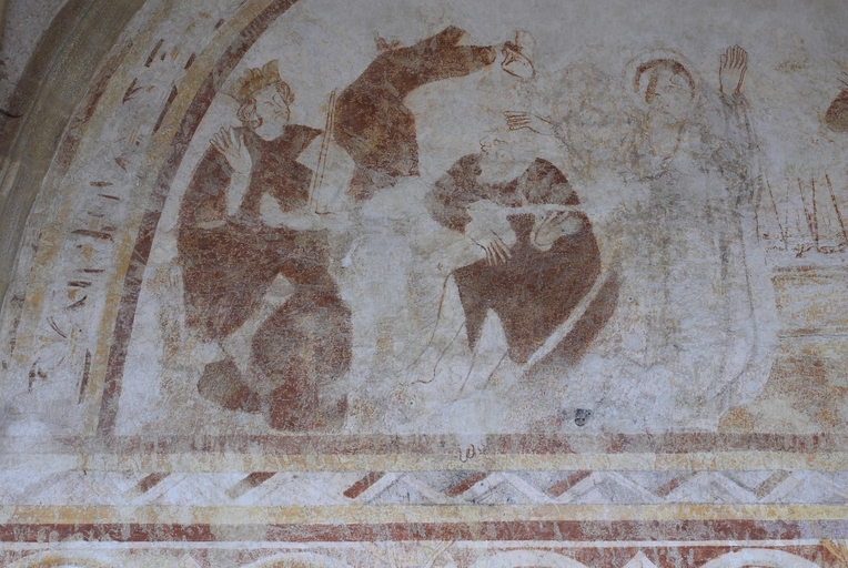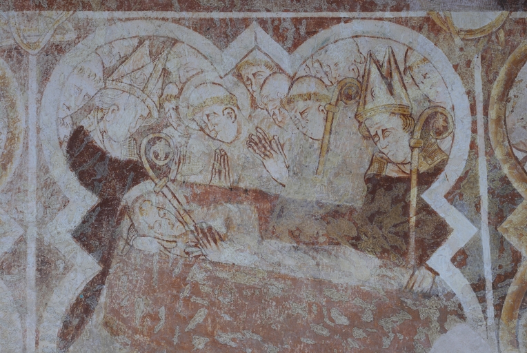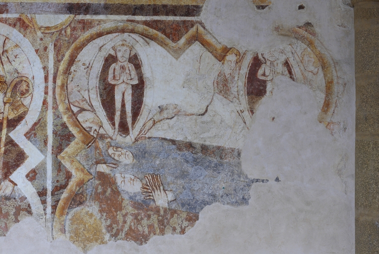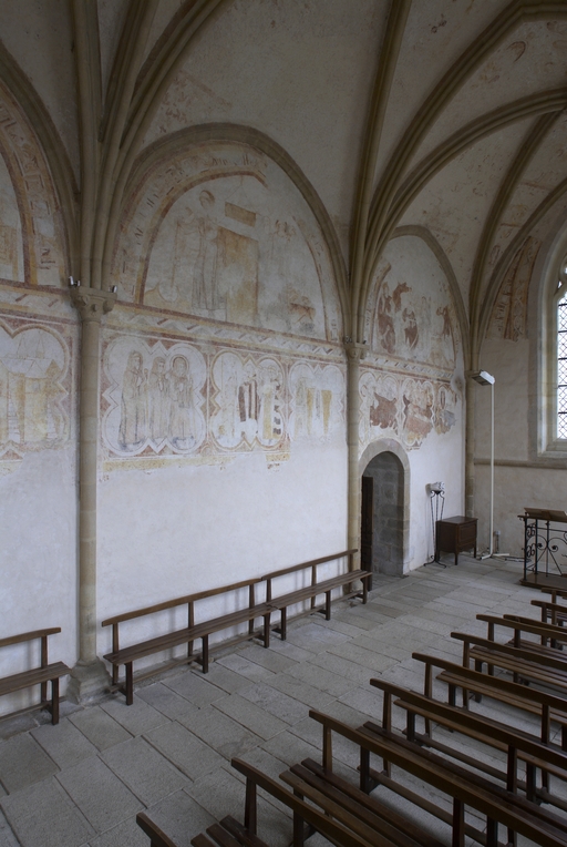 Lors de cette campagne de construction, les arcades sud de l'ancien chœur roman, qui devaient ouvrir sur un collatéral, ont été condamnées. Cet espace de 14 m sur 5 m désormais fermé a été voûté de trois travées d’ogives, et ses murs reçoivent, vers 1300, un décor de peintures murales illustrant la vie de saint Méen. Contrairement à l'opinion avancée par plusieurs auteurs, cette pièce n'a probablement jamais été une salle capitulaire : son emplacement, à l'opposé de l'ancien cloître au nord, infirme radicalement cette thèse hasardée sur une simple similitude d'aspect. Elle semble bien plutôt avoir été conçue dès l’origine pour renfermer l’important trésor de l’abbaye, qui abritait entre autres précieuses reliques les chefs et bras reliquaires de saint Méen et de saint Judicael, mentionnés dans une description de 1646. Son unique accès d'origine, par une petite porte dans le mur sud du chœur, ses voûtes d'ogives et ses fenêtres encore garnies de leurs grilles d'origine semblent appuyer l’hypothèse. Le style des peintures murales et la représentation dans une des scènes d'un carme au manteau rayé, abandonné par cet ordre au profit du manteau blanc à partir de 1287, situent ces peintures aux alentours de 1300. L'ouverture actuelle de cette pièce sur le bras sud du transept après démolition du refend qui l'en séparait résulte de sa transformation au XVIIe siècle en chapelle dédiée à saint Vincent Ferrier, puis de nouveau en sacristie au XIXe siècle.