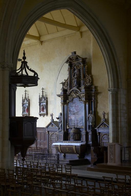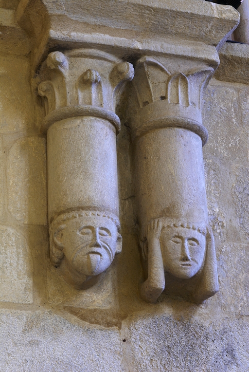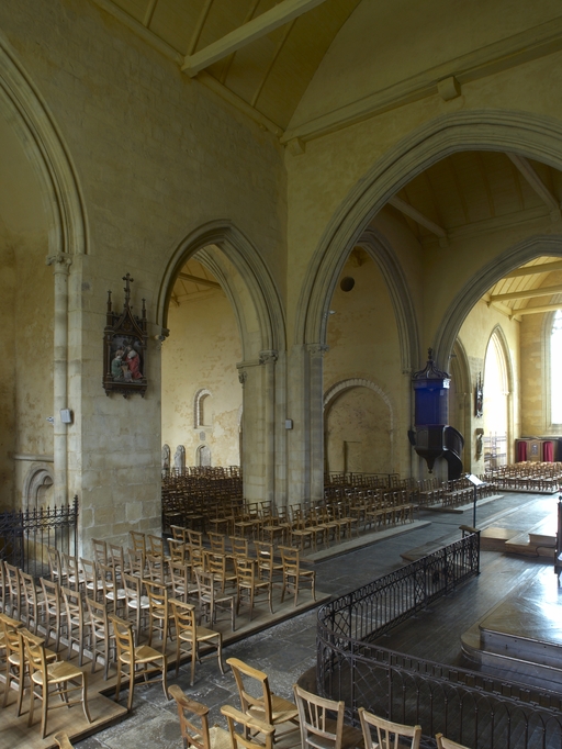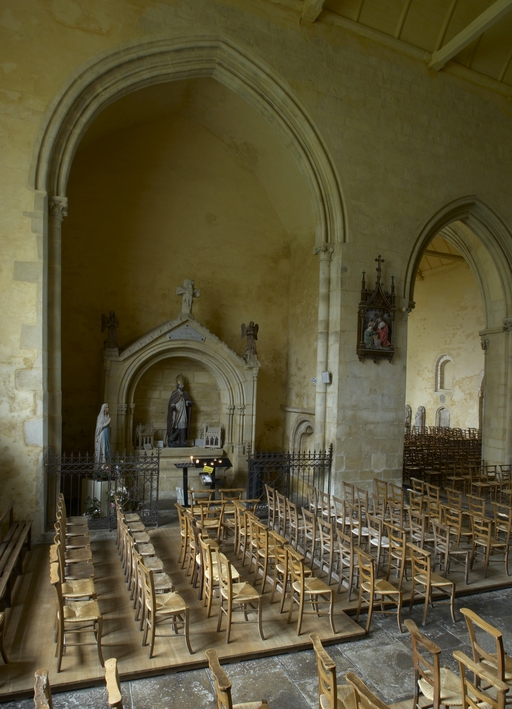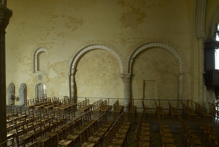 L’église, plusieurs fois sinistrée et reconstruite par étapes aux XIe, XIIe, XIIIe et XIVe siècles, pose de nombreux problèmes d’interprétation. La nef, remontant d’après d’anciennes descriptions à l’époque pré-romane, en très mauvais état au XVIIe siècle et déjà désaffectée au début du XVIIIe, fut finalement détruite vers 1775. Lors de travaux de consolidation de la première moitié du XVIIIe siècle, le pignon du bras nord du transept fut démoli et remplacé par une croupe, ce qui a entraîné une réduction de la hauteur de la baie. Le transept servit alors de nouvelle nef ; pour installer des retables, plusieurs baies furent bouchées dont la maîtresse vitre du chœur, et la porte ouest alors remontée au pied de la tour. En 1850, l'ancienne église abbatiale devenue paroissiale, désormais réduite au transept et au chœur, fut réorientée, le portail ouest de nouveau remonté dans le pignon est, le clocher à l’ouest de la croisée devenant le chœur et l’ancien chœur servant de nef. Enfin, l'ensemble du chœur est couvert par un toit unique qui englobe les deux anciennes charpentes du vaisseau central et du collatéral nord. Les récents travaux de restauration ont permis de découvrir dans le mur sud de l’ancien chœur deux arcades à doubles rouleaux retombant sur une pile à colonne monolithe, deux oculi à l’aplomb dans l’axe ainsi qu'une baie à ressaut à l’est, de la fin du XIe siècle, vestiges probables de l’ouverture d’un bras de transept plus bas que le vaisseau principal, disposition caractéristique des débuts de l’époque romane. L’emplacement de la tour, qui n’est pas à la croisée, confirme l’ancienneté du plan originel. Ses murs épais, une porte et deux baies géminées au nord, semblent remonter à la seconde moitié du XIIe siècle. Son dernier étage ainsi que les chapiteaux et les culots figurés de sa voûte se situent vers 1200. Le transept et le chœur furent reconstruits à partir de la seconde moitié du XIIIe siècle.