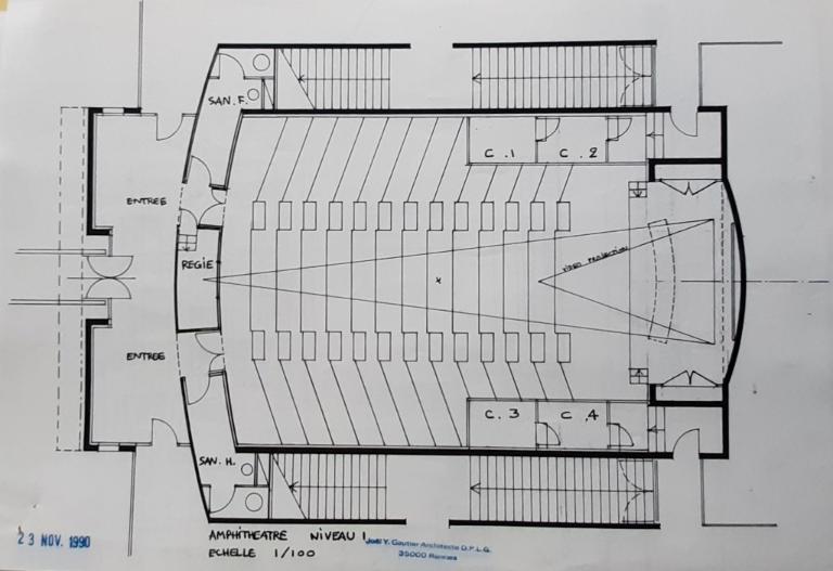 Il reçoit le nom de Sévigné, à la fois évocateur du nom de la commune et de celui de la Marquise, sans toutefois s'y référer de façon trop explicite, dans la mesure où ses évocations des révoltes bretonnes dont elle fut contemporaine sont parfois considérées comme méprisantes. Le nom du sculpteur Jean Boucher (1870-1939) également suggéré, a été donné à l'amphithéâtre.