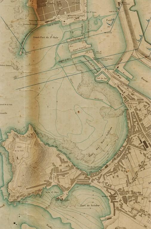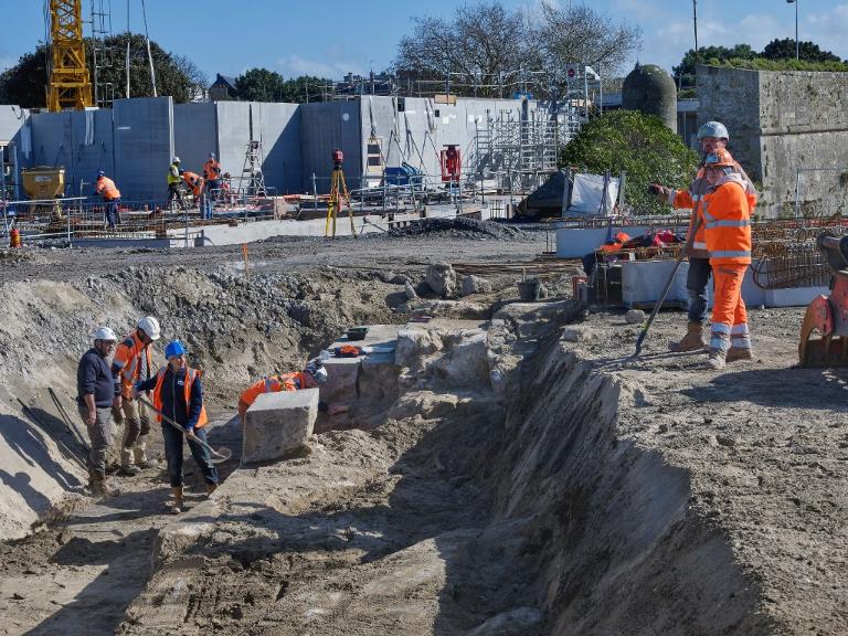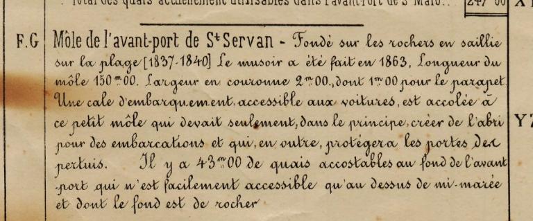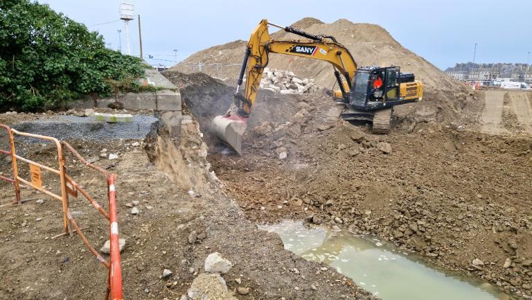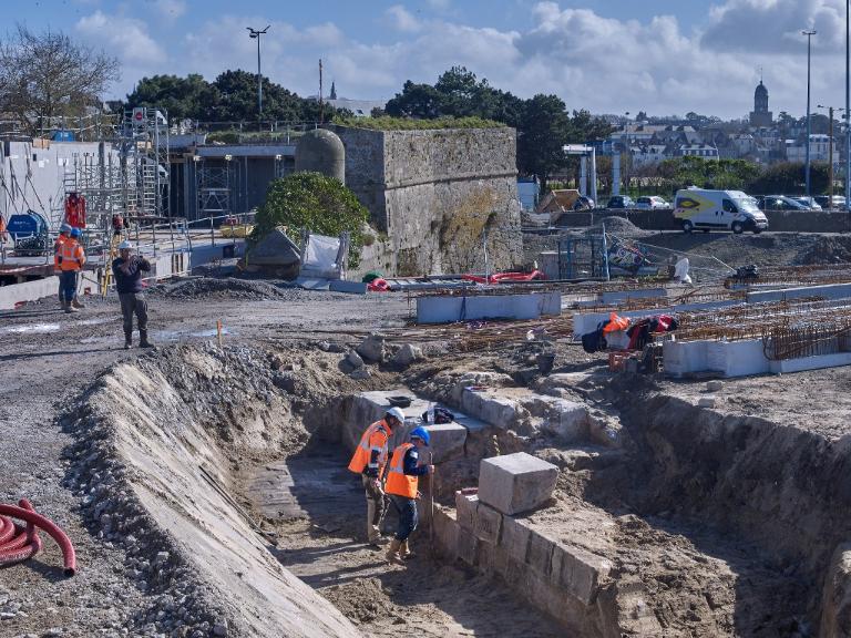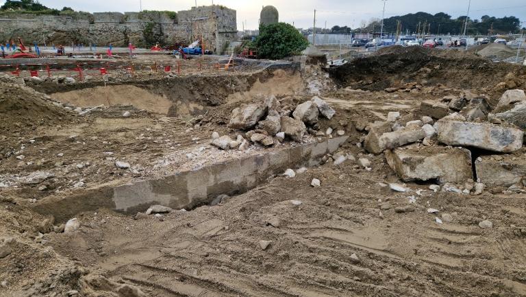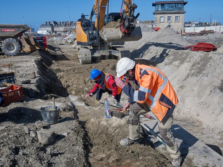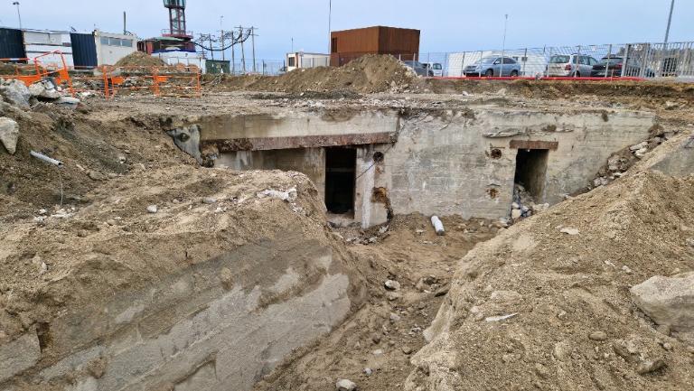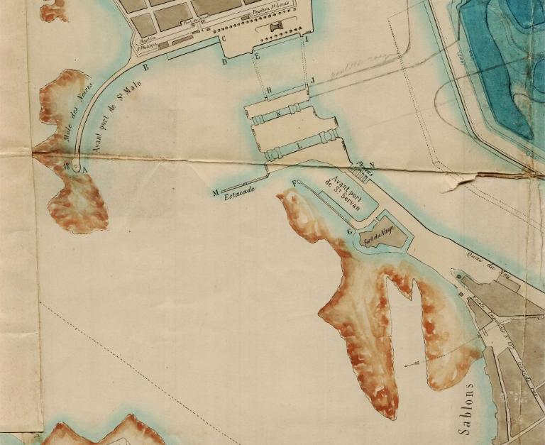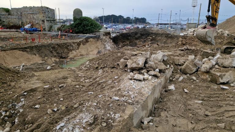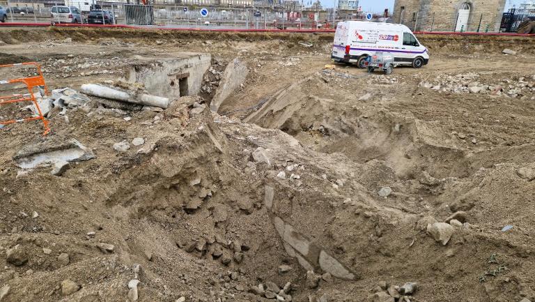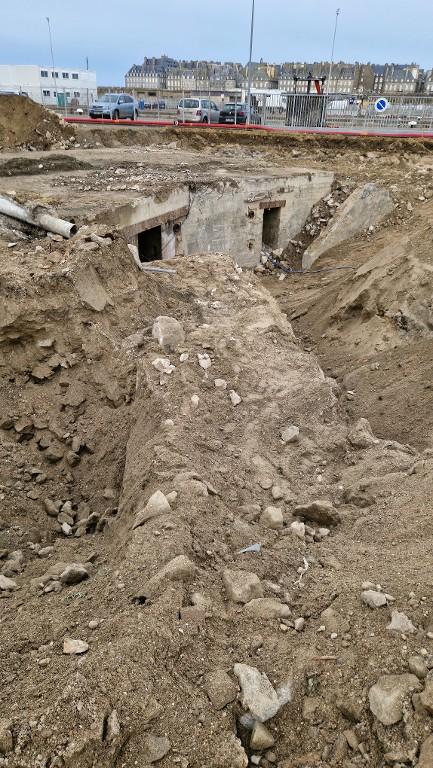 Datant des années 1837-1839 et remblayée en 1929 lors de la construction de la grande écluse du Naye, la digue de l’avant-port de Saint-Servan est ressortie partiellement de terre en novembre 2025 et en février 2026 lors des travaux de la nouvelle gare maritime du terminal Ferry du Naye. Le chantier a permis de documenter la démolition partielle de la digue de l’avant-port lors de la construction de l’un des bunkers de la batterie antiaérienne lourde du Naye durant la Seconde Guerre mondiale.
