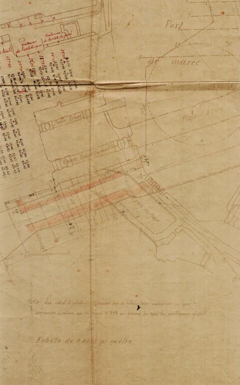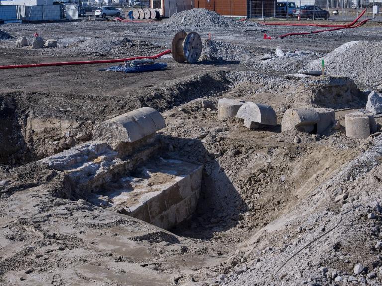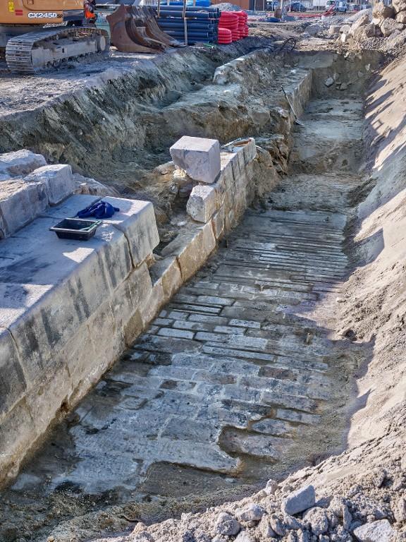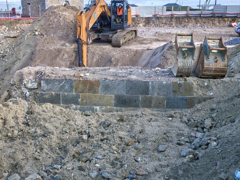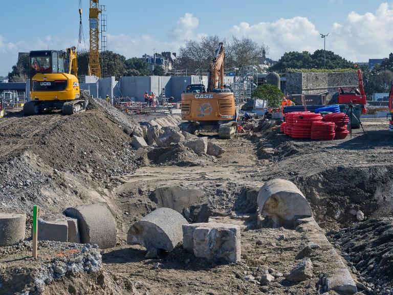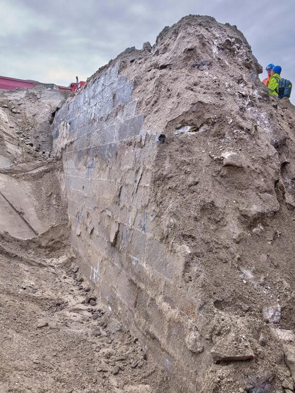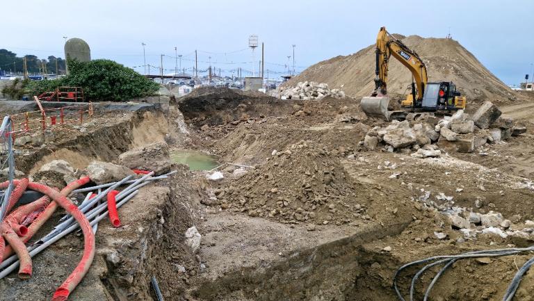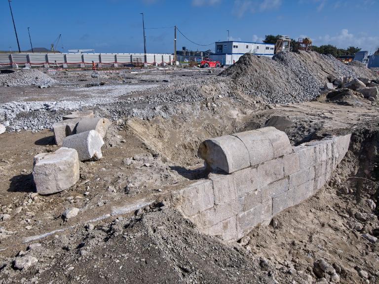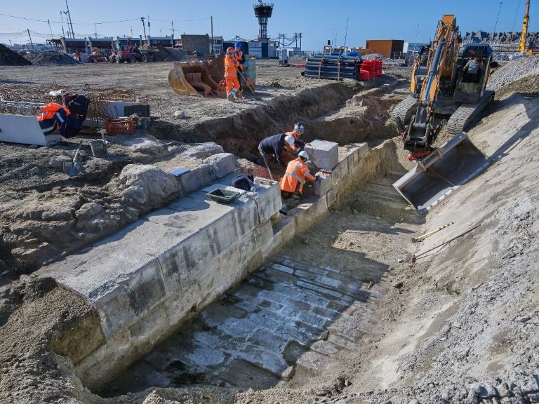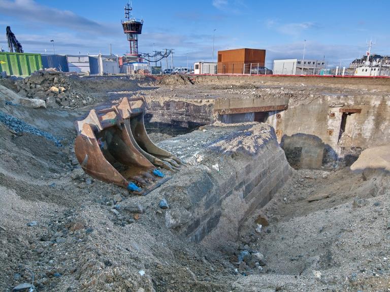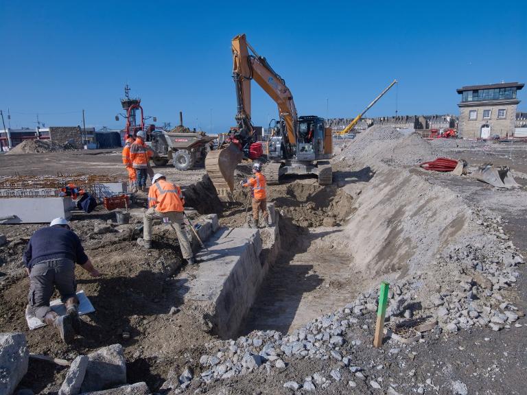 Datant des années 1837-1839 et remblayée en 1929 lors de la construction de la grande écluse du Naye, la digue de l’avant-port de Saint-Servan est ressortie partiellement de terre en novembre 2025 et en février 2026 lors des travaux de la nouvelle gare maritime du terminal Ferry du Naye. Le chantier a permis de documenter la démolition partielle de la digue de l’avant-port lors de la construction de l’un des bunkers de la batterie antiaérienne lourde du Naye durant la Seconde Guerre mondiale.