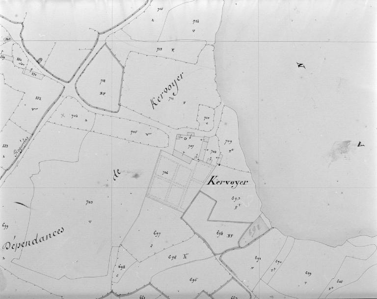 Manoir attesté en 1443 appartenant à Jehan Sigalo, "demeurant en son hostel de Kervoyer". Chapelle datant peut être du 18e siècle, détruite et reconstruite en 1911. Château construit en 1885 pour le marquis de La Révellière, s'appuyant sur le manoir antérieur, détruit par les allemands en 1944. Ferme et colombier datant de la fin du 19e siècle. Colombier, chapelle et ferme conservés. Enquête interdite..