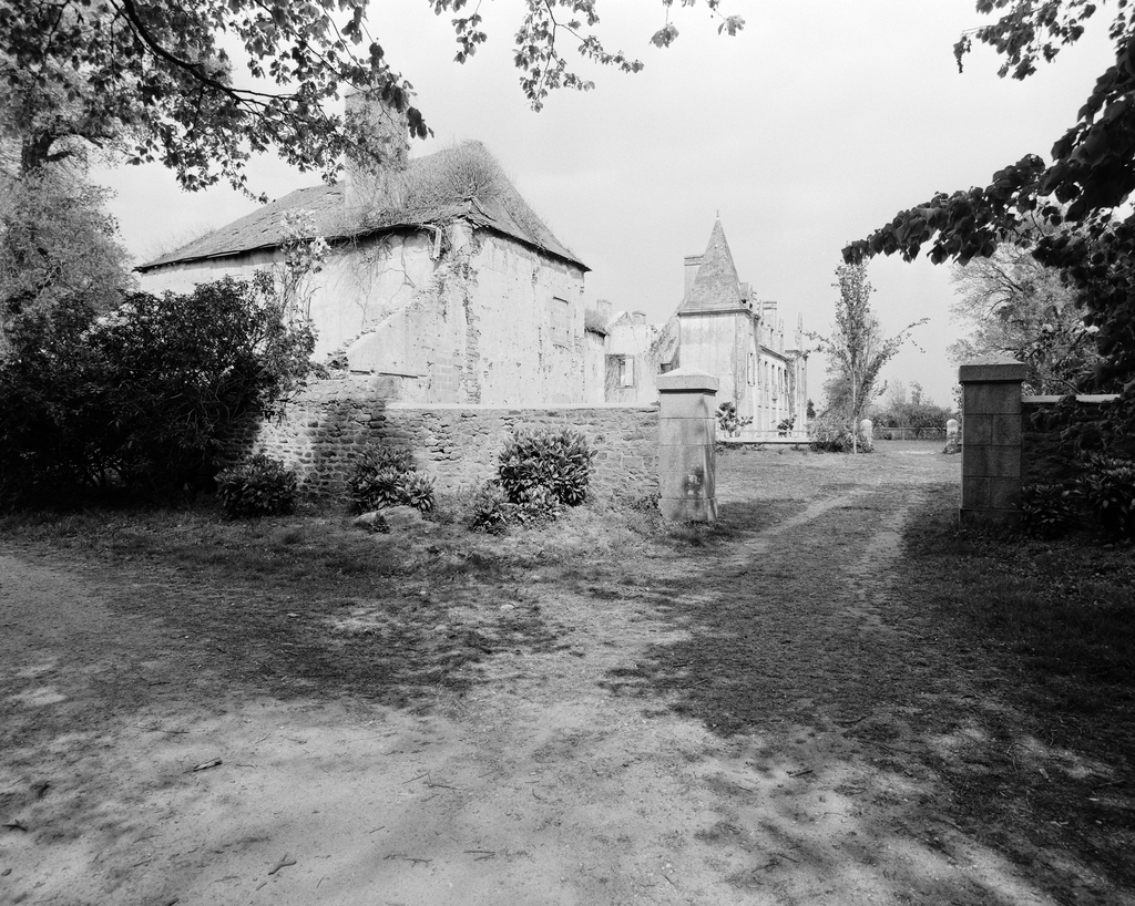 Le château est composé d'un corps principal enduit à cinq travées et de deux corps latéraux inégaux à une et deux travées également enduits, couverts d'un toit en pavillon, et d'un large corps postérieur d'escalier, couvert d'un toit à longs pans. La maçonnerie des communs est en moellons de granite enduits avec chaînes d'angles et bandeau peints. Le plan en L est régulier : à étage carré couvert d'un toit à croupe pour la partie en retour correspondant au logement des domestiques, à haut surcroît couvert d'un toit à longs pans et pignon couvert pour l'autre partie correspondant aux écuries. La maison de gardien en moellon est de type logis double à comble à surcroît, couverte d'un toit à longs pans et pignon couvert. Un vivier situé au nord du château est partiellement maçonné. Il est associé à un lavoir double en moellon et pierre de taille.