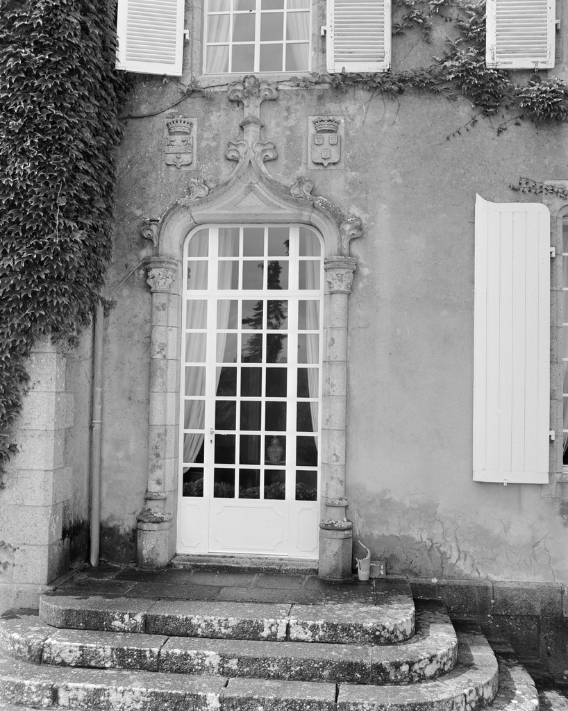 Des armes non identifiées sont sculptées au-dessus de la porte d'entrée. Celle-ci est surmontée d'une accolade ornée de choux frisés et d'un fleuron..