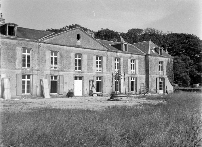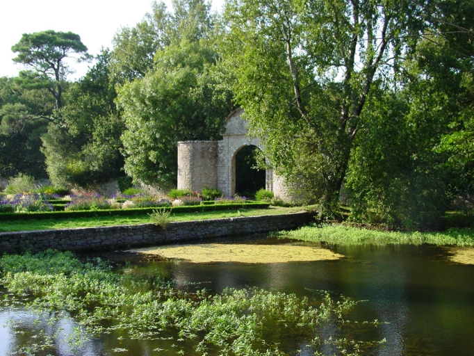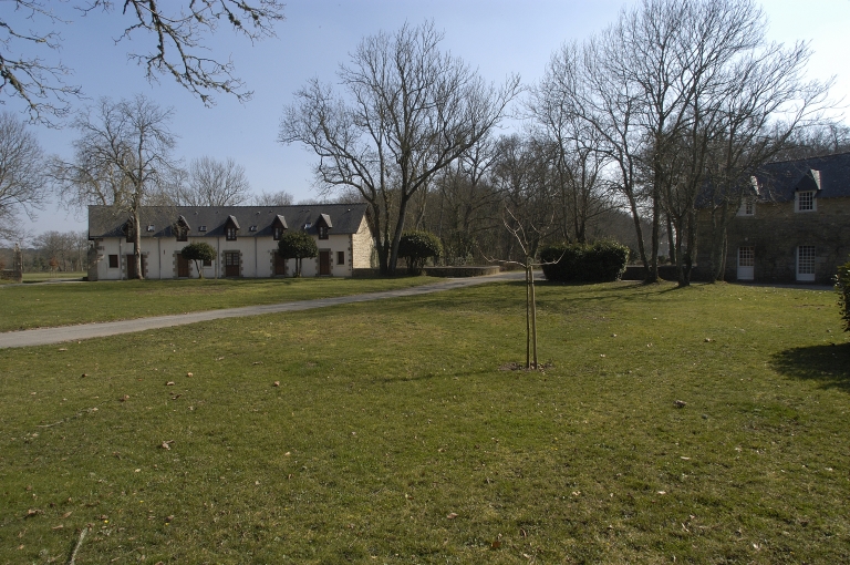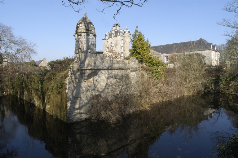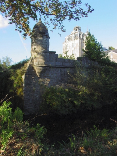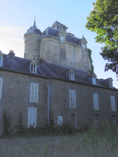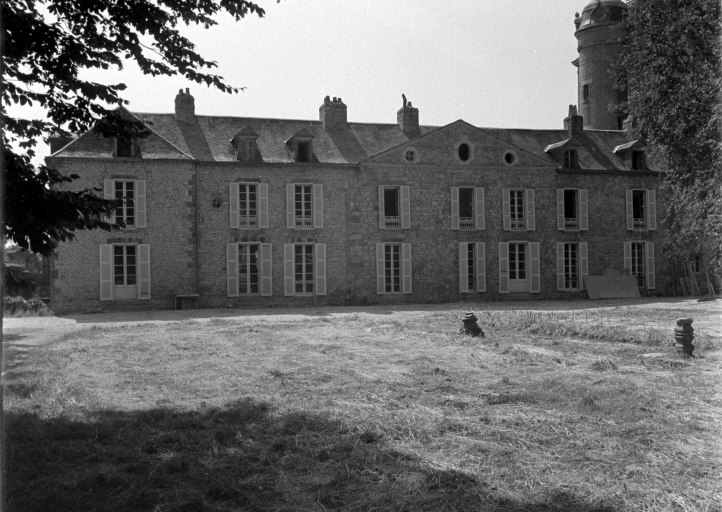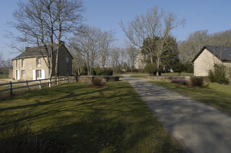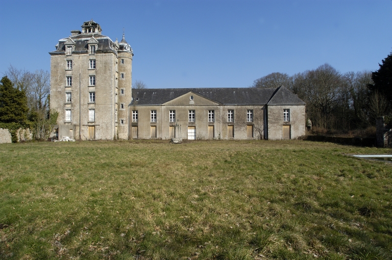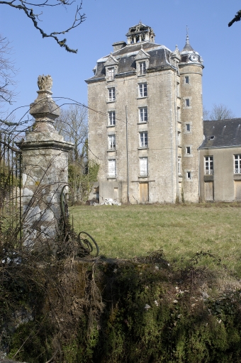 Situé au nord-est du bourg, le château de Keravéon et ses dépendances, sont implantés à toucher le village de Keroret, où se trouvaient ses principales métairies sous l'Ancien régime. C'est une imposante demeure seigneuriale protégée par une triple enceinte, mise en perspective par l'allée principale du parc : celle de la cour du logis, celle des communs et celle de l'enclos avec porte d'entrée majestueuse au sud. Le logis : il est situé au nord du parc, à l'est d'une cour cernée de douves (à l'ouest et au sud). Il présente une double façade aspectée à l'ouest et à l'est. Il est composé d'un corps principal à sept travées dont les trois du milieu sont réunies sous un fronton triangulaire, et de deux ailes double en profondeur, formant pavillons d'angle, dont celle au nord occupée par l'ancien donjon remanié. Côté est, les pièces en enfilades reflètent une disposition probablement imposée par le logis ancien dont on a conservé les refends. Côté ouest, deux niveaux de galeries confèrent à l'ensemble un faux plan double en profondeur. Au RDC, la galerie est dallée de pierres blanches et cabochons de schiste noir. L'ensemble est distribué par deux escaliers : la vis de la tour nord et un escalier en charpente, médiocre, dans l'aile sud, dans le jour duquel est aménagé un ascenseur pour l'hôtellerie (1972-1992). Les corniches et les lucarnes (disparues) de la façade ouest, celles des frontons, les oculi sont en pierre blanche. L'enduit côté est a disparu, celui de la façade ouest a été mal refait, faisant disparaître les bandeaux d'étage. Cette composition régulière sous toitures de long pan et noues sur les frontons de la partie centrale, reflète l'inspiration néoclassique du 1er quart du 19e siècle. A noter une cheminée de style néoclassique au RDC d'une salle à l'est de l'aile nord. Le donjon : Il est représenté sur le plan cadastral de 1811 et a été englobé dans les extensions nord du logis. A noter l'épaisseur des murs des premiers niveaux qui laisse transparaître l'ancienneté de cette construction. De plan rectangulaire, il présente 4 étages et un étage de comble sous le toit en pavillon brisé. Au sommet un lanterneau sert de belvédère d'où l'on peut embrasser le paysage alentour jusqu'à Lorient. A rapprocher des toitures de Kergonano en Baden. La tour d'escalier ajoutée dans l'angle sud-ouest avec le logis principal est coiffée d'un toit conique brisé, avec oculi et haut épi de faîtage en zinc. Elle est contemporaine de la reprise du donjon, le tout dans un style éclectique mais toutefois assez austère, qui reflète le travail des ingénieurs dans le premier quart du 19e siècle. L'enceinte de la basse cour du château : elle est conservée au sud et à l'ouest, où subsistent des douves en eau. Au sud, elle intègre une porte avec pont-levis (détruit) dont on distingue toujours une partie des dispositifs telle les trémies des potences relevant le pont. En encorbellement sur les angles sud-est et sud-ouest, deux échauguettes en pierre de taille sont percées de petites bouches à feu pour armes légères, et coiffées d'un dôme terminé d'une boule. Les armes de Talhouët et alliés (à vérifier) sont sculptées sur leurs parties basses vers l´extérieur, ainsi que sur les pilastres du parapet de l'enceinte. Le puits dans la cour à l'ouest du logis est de plan circulaire, en pierre de taille, avec substructures en fer forgé. La clôture du parc : prenant la forme générale mais irrégulière d'un quadrilatère, elle est constituée d'un haut mur de moellons, dont la partie sud, où se trouve le portail de l'entrée principale, est traité comme une enceinte fortifiée. Précédée et mise en perspective par des douves remplies d'eau, le portail est une porte monumentale en pierre de taille, flanquée de deux tourelles en moellons (ajout du 19e siècle). La porte charretière est surmontée d'un fronton cintré portant les armes de Keravéon en grande partie illisibles. Une poterne latérale existe à l'est de la tourelle orientale. A l'est du portail, une tour basse construite en moellons sert de plateforme pour la surveillance de la route vers Keroret. Les dépendances : les écuries sont bâties au sud du château, suivant un plan néoclassique en double arc de cercle de part et d'autre de l'allée centrale. Au sud, elles sont défendues par des fossés remplis d'eau. Propriété de la commune, elles sont très remaniées. La ferme, au nord du château n'est pas repérée. La maison du gardien, comportant en façade ouest, des remplois d'une ferme du 16e siècle de Locoal-Mendon, est un pastiche des années 1930. Le colombier et l'orangerie font l'objet de sous dossiers.