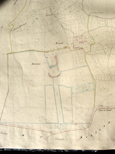A. D. Morbihan. 3A 3, domaine royal d´Auray, réformation du domaine, copies et enregistrement des déclarations de 1679-1683. Copie du volume 7, folio 2289, de l´original. 1683, le 4 août : Dénombrement rendu par Jean de Talhouët, chevalier, seigneur de Queravéon, baron de Coet (?), conseiller honoraire au parlement de Bretagne. En la paroisse d´Erdeven : Le lieu maison et manoir noble de Queravéon avec ses édifices, chapelle, douves, pavillons, tours et tourelles, haute et basse cour, grandes et petites écuries, fanerie et boulangerie, four et fournil, chenil, avec de vieilles ruines d´un colombier. La maison principale avec sa cour entourée d´eau et de douves et pont-levis, au derrière de laquelle est un petit jardin et parterre à fleurs avec levée et rempart, un petit boccage vers l´occident et un petit verger vers l´orient ; le grand jardin y joignant au bas duquel est un labyrinthe et grand verger, le tout entouré de murs et promenades ; au devant et côté de la dite maison bois de haute futaie, taillis, fenils et garenne, le tout s´entretenant cerné de murailles, contenant ensemble quarante journaux de terre, joignant au chemin qui conduit au bourg d´Erdeven à Auray, de plusieurs endroits aux terres de la métairie et tenues ci après déclarées. A cause de laquelle maison le dit seigneur a prééminence en l´église de St Pierre d´Erdeven. A Queroret, la métairie noble de Queravéon, possédée à domaine congéable par Guillaume Le Diraison et consorts, située proche le village de Queroret (etc) joignant de deux parties à l´enclos du dit lieu et au chemin qui conduit à Auray. La moitié d´une métairie noble, au dit village, possédée comme dessus par Michelle Runigo (etc) joignant aux terres de la précédente métairie, aux terres du sieur de Larlan (Kercadio), et aux franchises du village. Suivent l´énumération des tenues (fermes) dites tenues toitues à Queroret, Kergehennec, les Sept saints, Querberdery, Manémeur, Penhoët, Saint-Germain, le Sach, Kereven, Loperhet, Kerbernes, Kerjouan, au bourg d´Erdeven, Kervinihy, Cruyonno (Crucuno), Keranroué, Kerevarch (Kervarch), des tenues par dehors à Lesveur, Kerguenec (Kerguehennec), Kerdavy (plus un convenant), Kerbihouart, Kergouet, Kervazic, et une autre métairie noble à Querdelam. Le moulin à vent de la seigneurie de Queravéon, proche le village de Manémeur, dite paroisse, avec son « distroict, mouttaux, gallouetz et dépendances » (etc) affermé à Jacques Le Baron. La falaise de Plouharnel qui commence proche le village de Loperhet et va jusqu´à l´île de Quiberon. Les étangs de la paroisse d´Erdeven : L´étang de Poublé, les étang de Coquel et de Quergrosse, l´étang et marécage de Crucuno à Auray, et de Quergouet proche la grande mer et Kerhillio, l´étang de Quergalevan, et les marais et étangs entre Penester et Quereven.