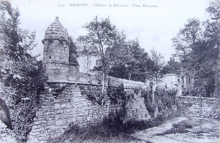 C'est à Pierre de Talhouët, issu d'un cadet de la maison de Pluherlin prénommé Guillaume, que l'on attribue la création de Keravéon en Erdeven, vers 1330-1350. Les Talhouët de Keravéon resteront maîtres des lieux jusqu'en 1761. Les Talhouët d'Erdeven avaient pour armoiries : un losange en bannière d'argent et de sable. Ce blason figure en plusieurs endroits dans l'église paroissiale et sur l'enceinte de la cour du château. Par voie de mariage la seigneurie et son domaine passent successivement aux mains des Cambout de Coislin, Adélaïde de Botderu, puis les Soussay (Danigo et Le Talec, 1971). Du logis médiéval on ne trouve plus traces à l'exception peut-être des parties basses du logis-tour rénové au 19e siècle. Il subsiste par contre les défenses sud de la basse cour : murs, porte à pont-levis, douves, parapets et échauguettes d'angles du 17e siècle, ensemble décrit en partie dans la déclaration de 1683 (documentation 5). Le logis du 18e siècle fut partiellement détruit à la Révolution. On reconnaît toutefois dans le portail d'entrée (ISMH, 1941) l'inspiration classique, ainsi que la remarquable orangerie récemment restaurée. Le colombier qui remonte à la même période (ISMH, 1945) est en ruines. C'est à l'époque d'Adélaïde de Cambout de Coislin, épouse de Victor de Botderu, comtesse de Botderu de Keravéon, que le château fut entièrement rénové. La comparaison des plans cadastraux anciens atteste de modifications importantes entre 1811 et 1845 : Intégration du bâtiment nord-ouest, actuel donjon, dans l'alignement d'un nouveau logis à l'est de la cour ; extension de celui-ci et construction de la galerie en façade ouest ; diminution de la largeur des douves sud ; destruction d'un corps de bâtiment ouest, laissant la place à un nouvel accès occidental à la cour ; construction des communs et écuries en arc de cercle au sud de l'enceinte du château ; construction des deux tourelles devant le portail 18e siècle, à l'entrée sud du parc ; nouveau tracé des jardins d'agréments dans l'enclos du parc. Plus précisément, entre 1822 et 1823, l'ancien donjon est complètement rénové aux frais de l'administration car cette tour sert d'amer aux navires qui croisent au large des côtes d'Erdeven (AD56, S 804). Elle figure encore sur les cartes marines du début du siècle suivant. Le rhabillage du donjon, sa surélévation, la construction d'une toiture en pavillon sommée d'un belvédère et la construction d'une tour d'escalier, sont l'oeuvre des ingénieurs des Ponts et Chaussées, dont Bondhore, ingénieur ordinaire et Kerano aîné, conducteur de travaux, qui suivent le chantier d'août 1822 à la fin avril 1823. Dans l'entre-deux-guerres, le comte de Soussay fit construire une maison de gardien à partir des vestiges d'une ferme (ou maison de prêtre) du 16e siècle, transférés depuis Kerdelame en Locoal-Mendon. Les communs ont été transformés en gîtes par la commune d'Erdeven, qui les a acquis à la fin des années 1970. Le château est inhabité depuis la fermeture de l'hôtellerie, en 1992.