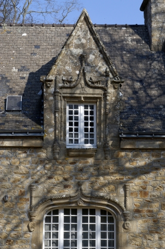 Armes de Keravéon et alliances sculptées sur parapet et échauguettes du mur d'enceinte de la basse-cour du château. Armes de Keravéon, sur le fronton du portail d'entrée.