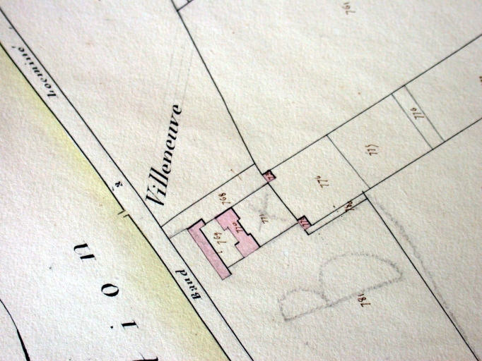 L'origine du château de la Villeneuve remonte au 15e siècle avec la famille Guido. De cette époque il ne reste aucun vestiges. Le château est reconstruit au 18e siècle, peut-être sous la famille La Coudrais, puis est démonté en 1930 pour être rebâti en retrait de la route. L'état du château avant démantèlement est visible sur une carte postale ancienne et sur le cadastre ancien de 1829 (parcelle 1388). Il était situé perpendiculairement à la rue, en saillie sur l'alignement. Ce bâtiment n'était cependant pas concerné par les projets d'alignement figurant sur le plan de Detaille de Keroyand : le projet prévoyait de couper les façades de la rive ouest de la rue. Un corps de bâtiment à élévation ordonnancée en rez-de-chaussée surélevé était accessible par un escalier extérieur droit central. Deux pavillons latéraux en avancée encadraient ce corps central. Le puits situé au sud de l'actuel château date de 1723. En 1907, et pour quelques années seulement, ce château est le siège d'une école d'apiculture qui fabrique le melcao, un produit à base de miel et de cacao.