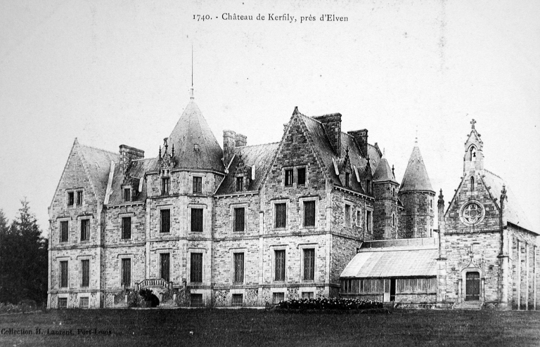 Siège d'une ancienne seigneurie mentionnée depuis le 15e siècle, Kerfily appartient à la famille de Narbonne en 1830. A cette époque, le château datant des 17e et 18e siècles est entouré d'un jardin, d'avenues, de communs, d'un pigeonnier. La propriété passe par héritage à Armand de Charrette vers 1850 ; celui-ci entreprend la construction d'un château neuf et de sa chapelle entre 1858 (ou 1860) et 1863. Le parc abrite les vestiges du château antérieur et d'une ancienne porterie. La chapelle privative de Kerfily (vers 1858) est dédiée au Sacré-Coeur.