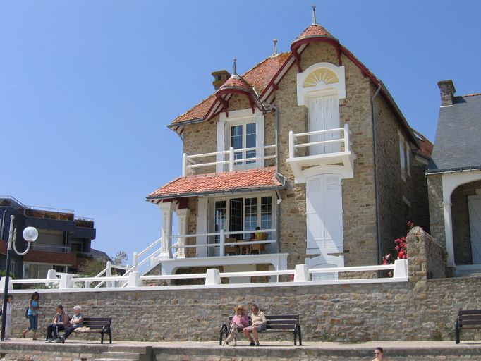 Cette villa de deux étages ne comporte aujourd´hui plus de nom. Sa façade en pierre est orientée vers la plage. Elle se divise en deux parties. La partie droite, formant pignon en façade, est plus avancée et comporte un alignement de trois portes-fenêtres. Le deuxième étage dispose d´un balcon avec garde-fou et d´un magnifique fronteau de couleur jaune et blanche. La partie gauche est plus compartimentée. L´entrée se fait par la terrasse du premier étage, protégée des intempéries par un grand balcon accessible du deuxième étage. Une colonne dorique supporte ce balcon. Deux guitares de lucarne (ouvrage de charpente composé de pièces courbes) sont avancées en façade de manière à protéger les ouvertures du dernier étage. La villa, rénovée en 2006, est un bon exemple des villas construites à Larmor-Plage au début du 20e siècle.