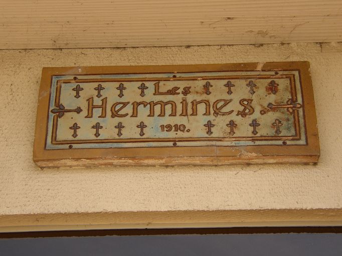 L´immeuble Les Hermines, qui remplace la villa du même nom, se situe quasiment à l´extrémité de la promenade de Port-Maria. Le seul souvenir de la villa, en guise d´hommage ou de clin d´oeil, se trouve au-dessus de la porte d´entrée. Il s´agit de la plaque qui portait le nom de la villa, « Les Hermines », avec sa date de construction, « 1910 ». Le terme de « hermine » ne doit pas être considéré sous le sens de l´animal mais sous le sens de l´héraldique (fourrure à mouchetures de sable semées sur champ d´argent), ce que la décoration de l´élément confirme. Cette plaque est le seul héritage de la plus importante villa construite au 20e siècle sur la plage de Port-Maria.