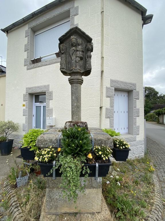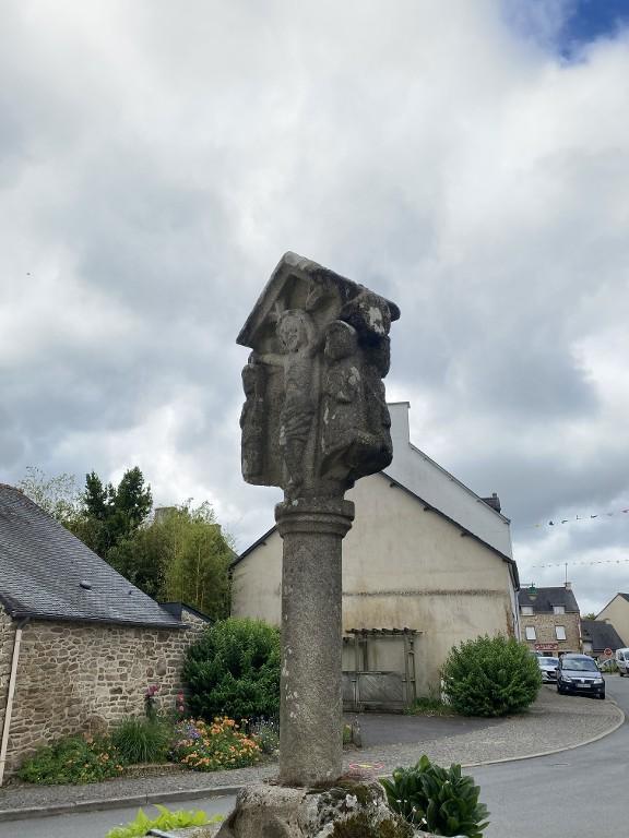 Croix-tableau à bâtière, sur socle et soubassement en pierre de taille de granite recouvert d'une dalle de granite moulurée ; fût de section circulaire à bague, enfoncé dans un socle carré à griffes. Décor en demi-relief ; sur une face : Calvaire ; sur l'autre face : Vierge à l'Enfant entre saint Jacques et sainte Catherine de d'Alexandrie ; la Vierge tend une pomme à l'Enfant ; l'épaisseur est occupée par un personnage. La croix a été retournée au remontage, la face la plus visible aujourd'hui étant celle qui porte la Vierge à l'Enfant.