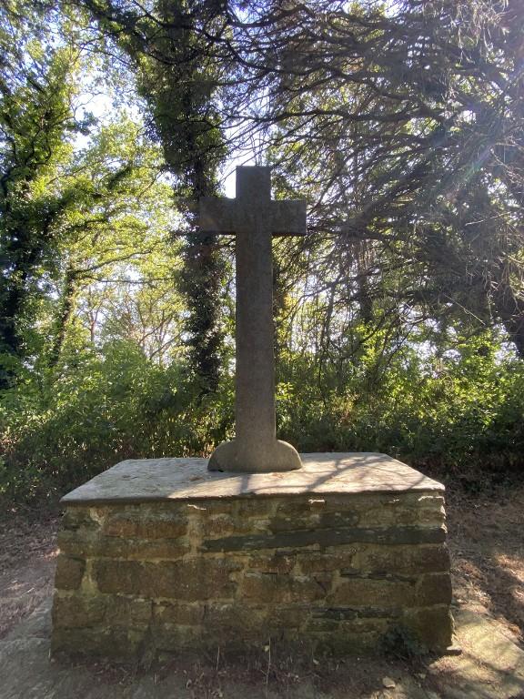 Croix palis en schiste à base élargie, sur soubassement en moellons de granite recouvert d'une dalle de schiste et reposant sur un emmarchement à deux degrés. Aucun décor ; quelques graffitis (?) gravés sur la face nord.