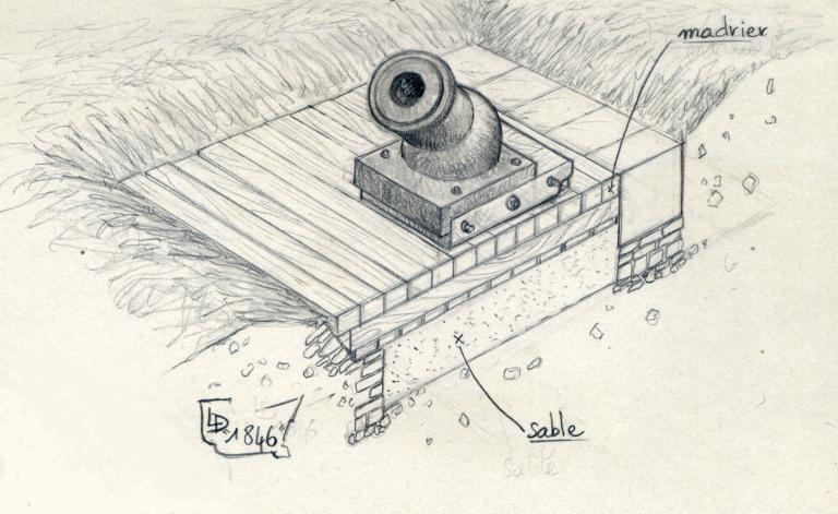 4°. Cette même délibération et ce même croquis admettent qu'on placera deux pièces sur chaque flanc et six pièces sur la face principale. Mais, comme l'armement total a été fixé à 8 bouches à feu seulement, dont deux mortiers, et que rien ne rend nécessaire une augmentation de deux pièces, il semble qu'il convient d'avoir une pièce et un mortier sur chaque flanc et quatre pièces sur la face principale. On réduira ainsi de 16m la longueur de cette face ;