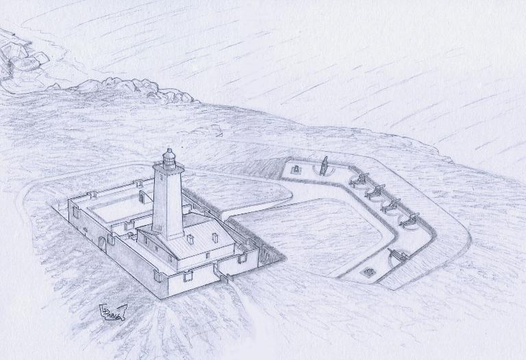 "La gauche de la batterie proposée sera sur le prolongement de la face droite du phare et à 50 mètres en avant, les pièces seraient dirigées partie sur le mouillage, partir sur la pointe de Trévignon ; elles seront défilées, par une traverse en capitale, des feux du large. Une tour n° 1 affectée à la défense de la batterie et contenant un poste de 20 hommes d'infanterie, sera en même temps le réduit de l'île ; elle sera placée à 100 mètres à droite et en arrière de l'épaulement de la batterie, de manière à être couverte des feux du large par la crête du plateau sur lequel s'élève le phare. La batterie sera reliée au réduit par un mur qui devra être bien flanqué et précédé d'un fossé".