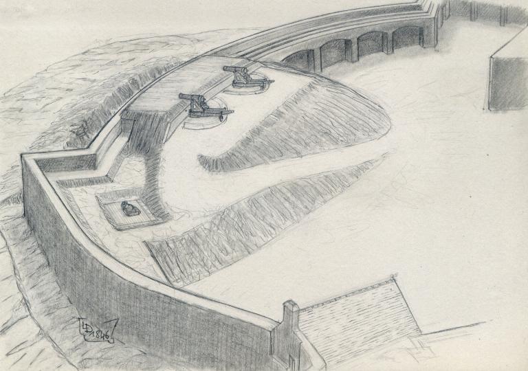 Dans les projets généraux pour 1847 (dessins n° 9 et 10), le Chef du Génie a présenté un premier projet de détail, dans lequel il prend pour les limites du champ de tir de la batterie, d'un côté, une ligne qui joint le centre de la partir Nord de l'ouvrage à l'le Tudy, et, d'un autre côté, le centre de la partie Sud au rocher de Méaban, embrassant ainsi les trois quarts d'une circonférence ; et il indique deux droites qui en diffèrent très peu comme représentant les limites des coups dangereux. Celle du Nord est donnée par le point de rencontre des deux cercles de 2,400 mètres de rayon, ayant respectivement, pour centres, le fort Cigogne et la batterie en projet. Cette batterie a sa crête à la cote 83m50. Elle est évaluée 20,00 francs et son réduit 38,500 francs ; en tout 58,500 F.