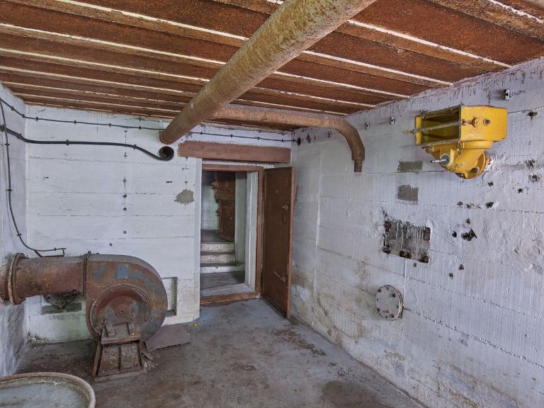 En entrant dans la salle de ventilation, sur le mur de droite subsiste un filtre dépoussiéreur de couleur jaune ; au fond à gauche, se trouve un ventilateur industriel servant probablement à l’extraction des fumées de tir des chambres de combat vers l’extérieur de la casemate. Sa plaque constructeur a été prélevée.