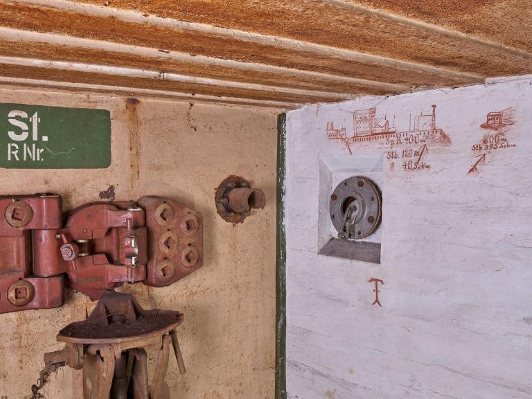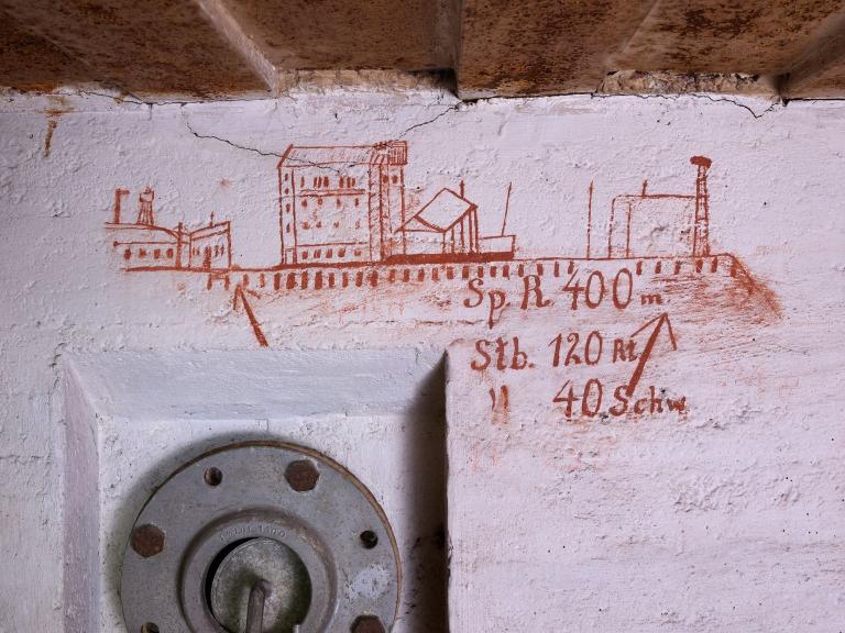 A droite de l’embrasure, directement sur le mur, est peint en rouge carmin le panorama de tir de la mitrailleuse, son emplacement, deux flèches et des repères en mètres ou cadences de tir : "Sp. R. 400 m / Stb. 120 Rt / [Stb.] 40 Schw". On reconnaît au centre le bâtiment frigorifique du port de pêche dit la Glacière.