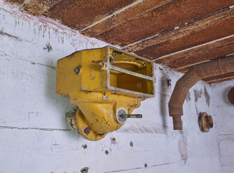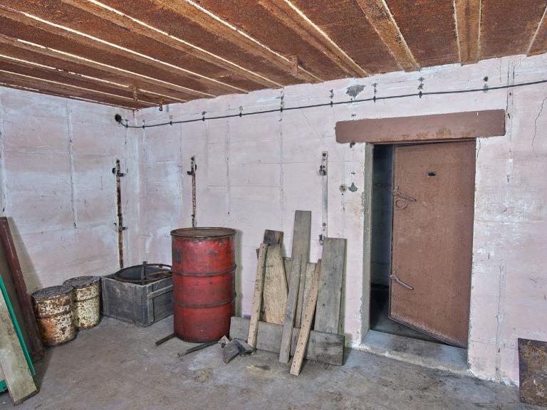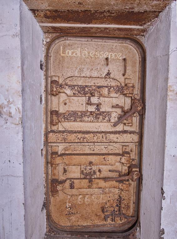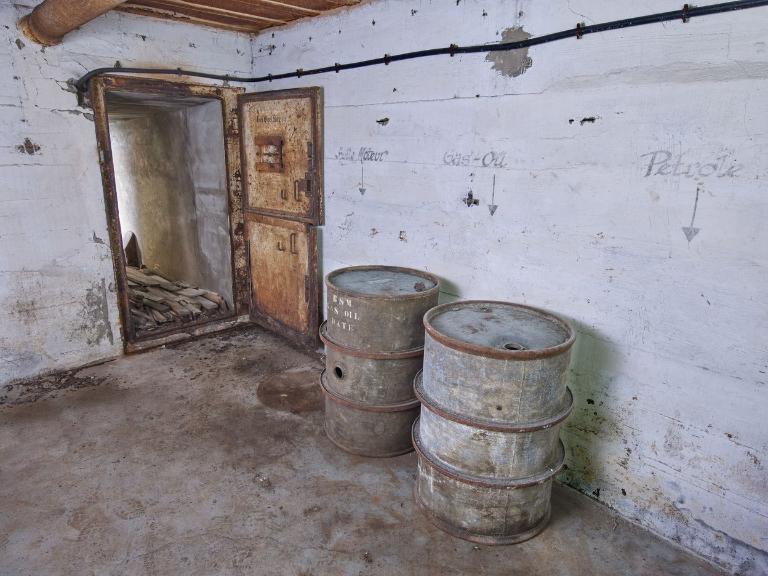 Le mur de gauche porte les inscriptions : "Huile Cylindre" (derrière la porte blindée), "Huile Moteur", "Gas-Oil", "Petrole" avec des flèches vers le bas - à l’emplacement des fûts - qui témoignent de l’usage ce cette pièce comme local à essence et magasin par la Marine française. Deux fûts métalliques de 200 l sont siglés "BSM GAS OIL / DATE".