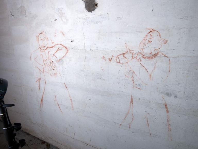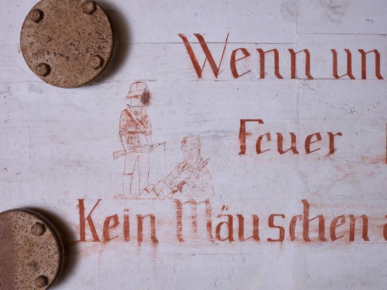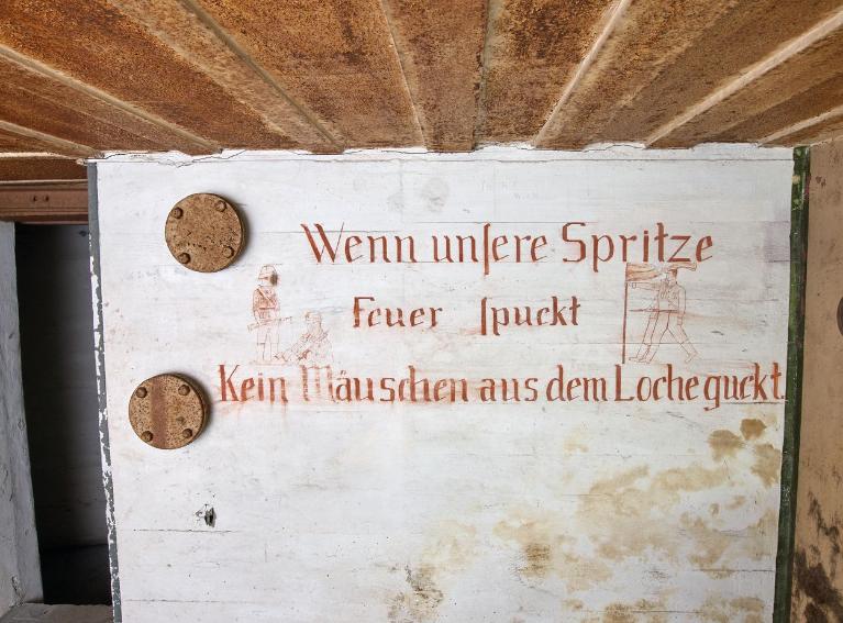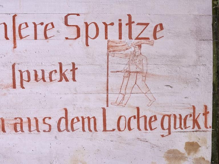 Sur le mur à gauche de l’embrasure : Deux soldats au repos dont l’un assis par terre et deux soldats défilant au pas portant un pavillon, "Wenn unsere Spritze / Feuer Spuckt / Kein Mäuschen aus dem Loche guckt", Quand notre fusil crache du feu, pas un souriceau n'ose sortir sa tête du trou.