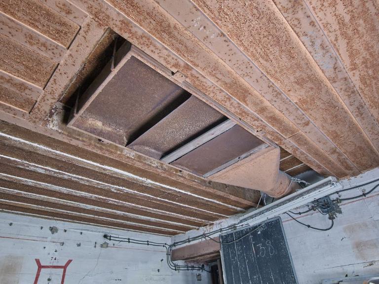 Dans le plafond, subsiste la bouche d'aspiration des fumées de tir. Afin de rendre homogène l'aspiration, la hotte est divisée par des lames en trois conduits. Le tuyau du système d'aspiration et d'évacuation des fumées de tir part dans le mur nord et rejoint vraisemblablement le ventilateur industriel situé dans la salle de ventilation.