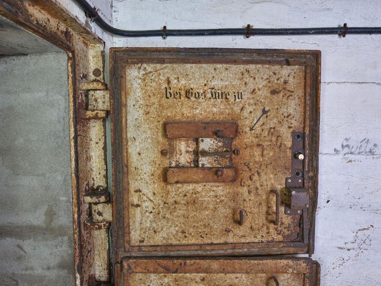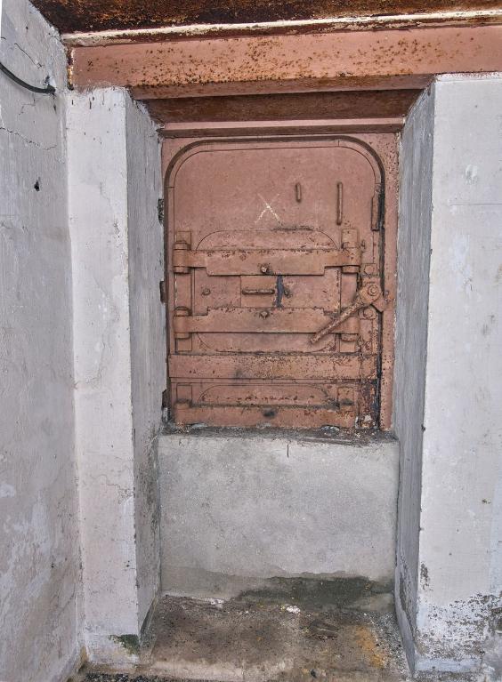 L’accès à la caponnière* (Nahkampfraum) de la casemate est contrôlé par une porte blindée étanche à deux vantaux aux angles arrondis de type 882P7. La porte de l’extérieur se ferme depuis le sas antigaz. Le vantail supérieur porte l’inscription "Local à essence" [période française] ; les vantaux sont numérotés.