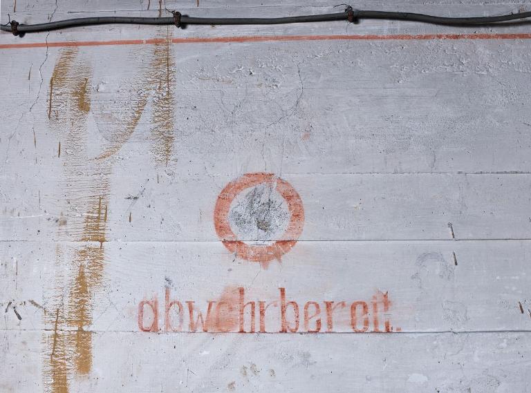Sur le mur opposé à l’embrasure : un aigle stylisé et croix gammée [en noir] accompagnés du cri de guerre "Jederzeit Feuerbereit" [en rouge carmin], Prêt au feu, à tout moment ;