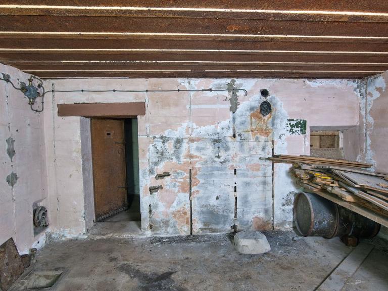 Les murs en béton, préalablement blanchis, sont peints en rose saumon. La pièce comporte une bouche de soufflage à vis réglable et une bouche de surpression à clapet à contrepoids. Des arrivées de câbles sont visibles au pied du mur oriental et une niche dans le sol est fermée par un panneau. Son poêle [disparu], dont on voit les conduits de cheminée et de ramonage, était implanté contre le mur sud. A proximité de son emplacement se voit un cartouche à fond vert en partie effacé. Le sol de la pièce imite un carrelage.