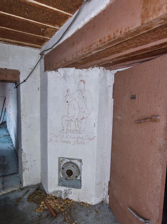 Sur le petit mur oblique, entre l’entrée de la chambre de combat pour canon et l’entrée de la salle de garde : un soldat, un peigne et une brosse à la main, coiffe les cheveux d’un soldat assis sur un tabouret, "Beim [B]unkerfriseur. / "Wüllst d’Hoar z’ruk, Seppl ?" / "Na, de konnsta g’holtn !", Chez le coiffeur du bunker : "Veux-tu que je te refile tes cheveux, Jojo ?" / "Non, tu peux les garder !", écrit dans un dialecte de l’Allemagne du sud. En-dessous de cette peinture, se trouve une bouche de surpression à clapet à contrepoids.