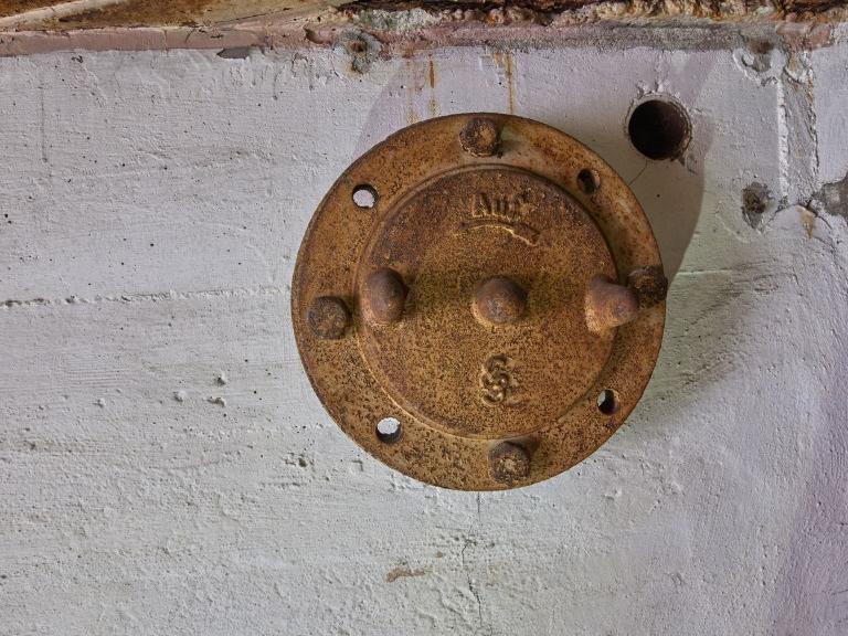 Sur le mur opposé à l’embrasure se voit l’emplacement caractéristique peint en rouge et la numérotation d’un extincteur de la Marine nationale [disparu].