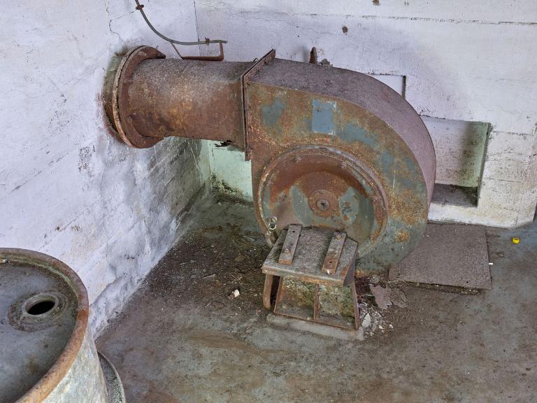 Les deux ventilateurs d’origine et leurs supports dont on aperçoit les emplacements, le deuxième filtre dépoussiéreur, des tuyaux et câbles électriques ont été prélevés. Les quatre fûts marquées Kriegmarine ont également disparu [cet ensemble a été publié dans Andersen Bö, 1994 et dans Luc Braeuer, 2008 - photographie daté de 1999. Il aurait été démonté après 2007. Une lampe murale étanche française apparait encore sur une photographie de juin 2019, mais a depuis également disparu.]