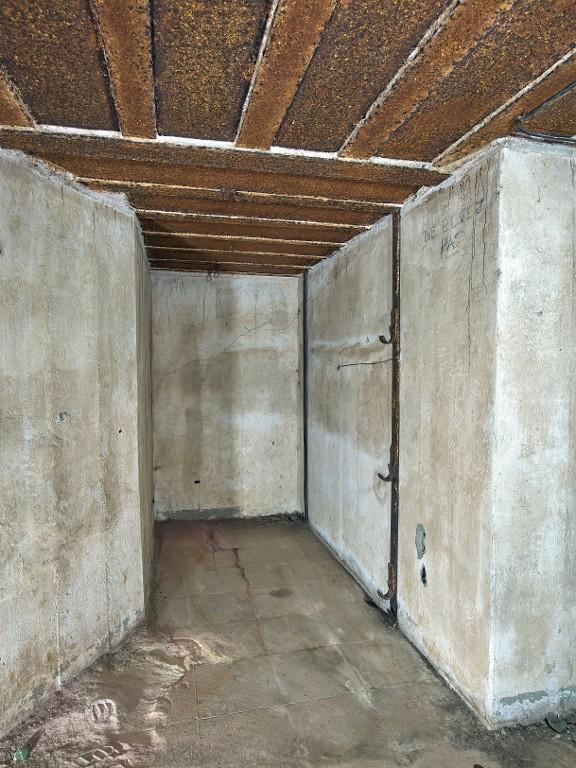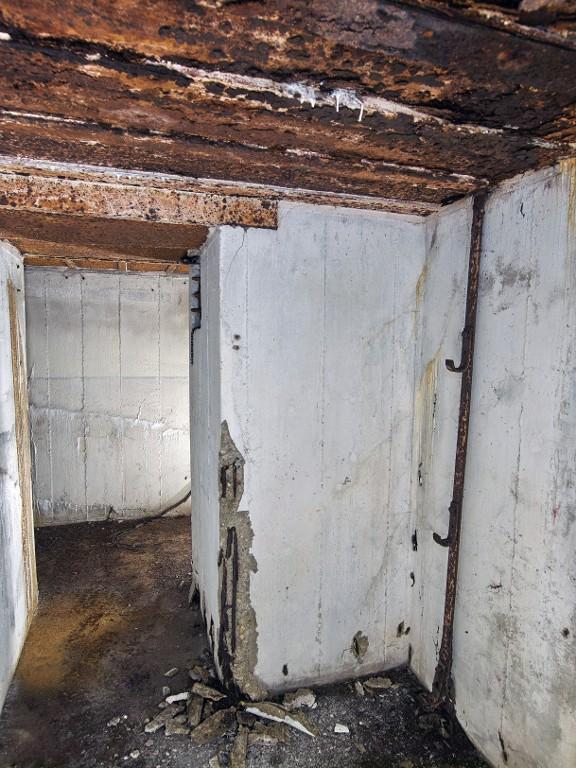 Chambre de combat nord-ouest [elle est partiellement inondée] : un seul cartouche, "St. 32 R.Nr. 65+66 [inscription quasiment illisible]" ;