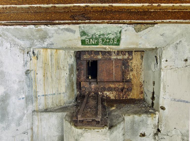 Chambre de combat nord : deux cartouches, "M.G. Nr. 2[?]5 08/15" et "St. 31 R.Nr. 60-64" ;