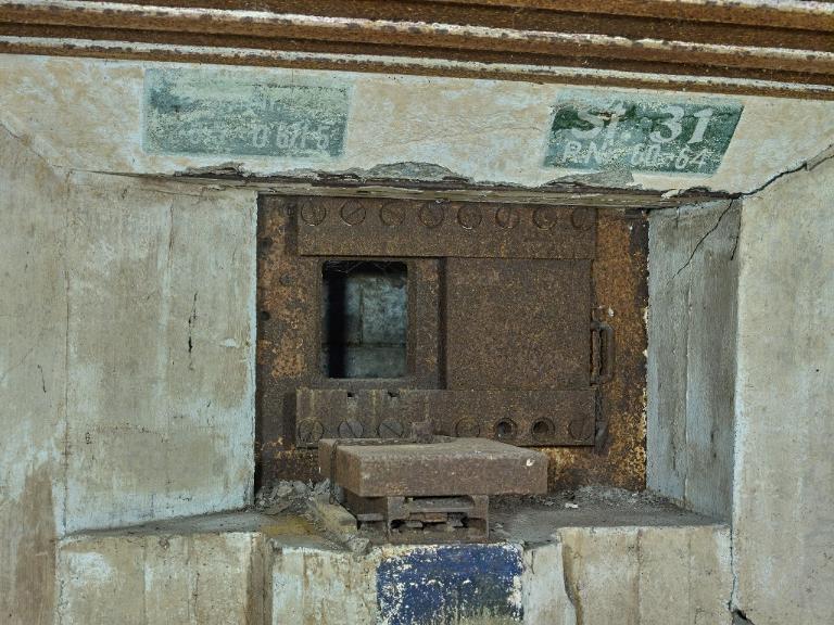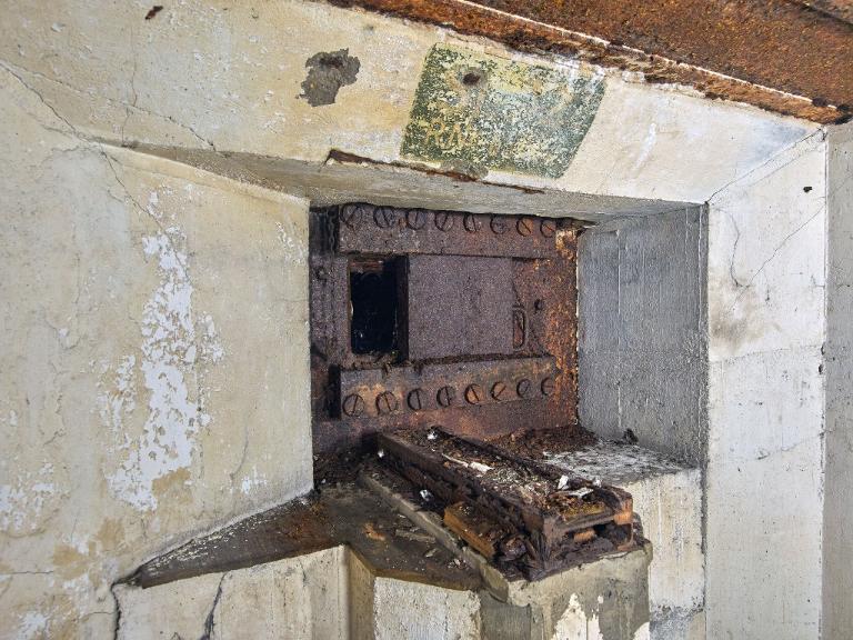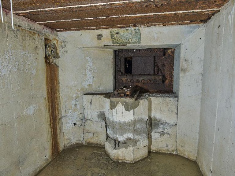 Un socle en béton armé, accolé à la plaque blindée, sert de support à un "affût de forteresse", sellette d’affût prenant la forme d’un rail à encoche [en place], sur lequel venait se fixer le traineau coulissant de l’affût de la mitrailleuse [disparu].