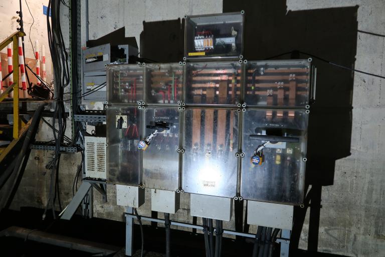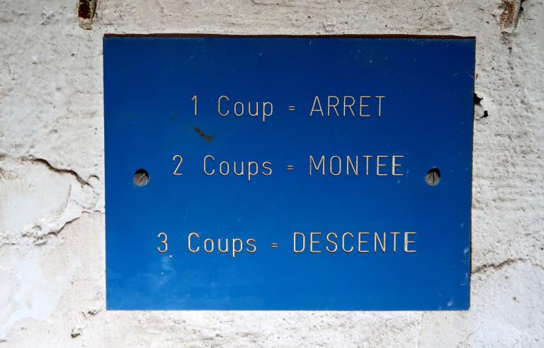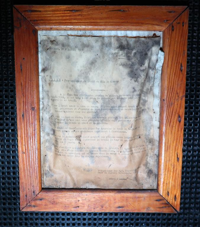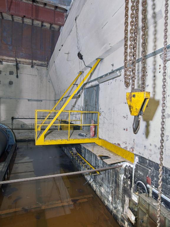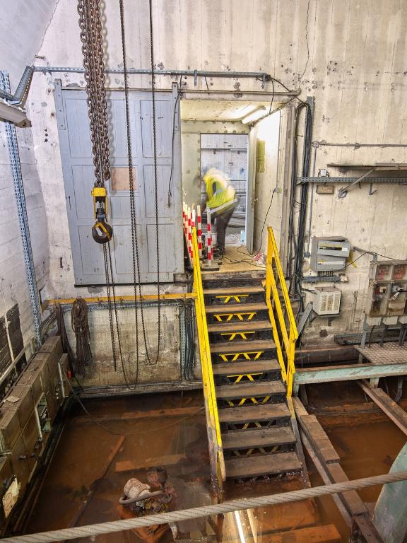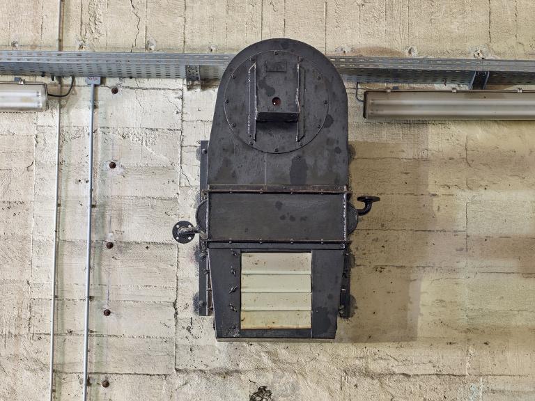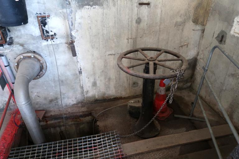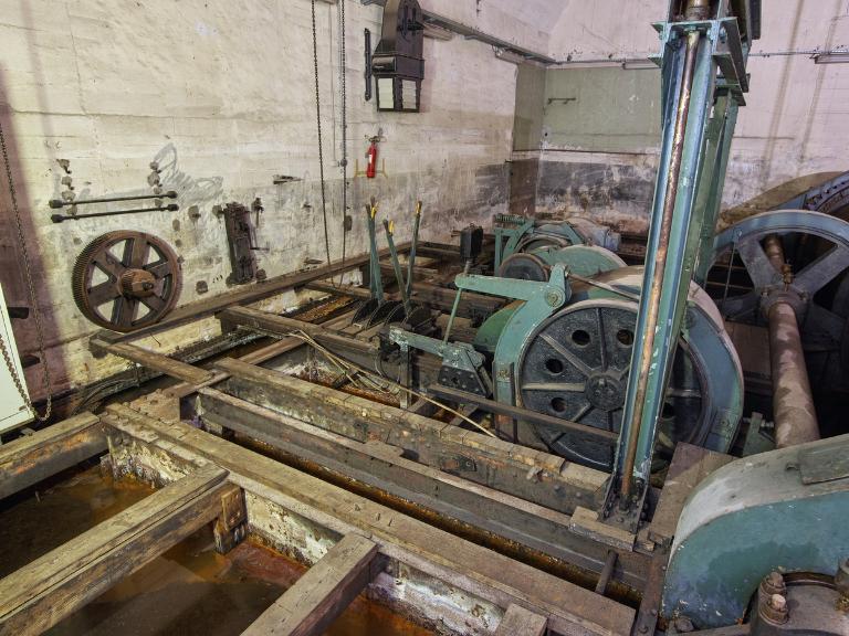 La pièce est inondée sur 40 cm de profondeur environ et le bas des tambours baigne dans l’eau (le niveau varie selon les saisons). L’assèchement de la pièce - sans mesure conservatoire des pièces métalliques - est à éviter : il entraînerait une dégradation rapide de l’installation.