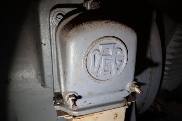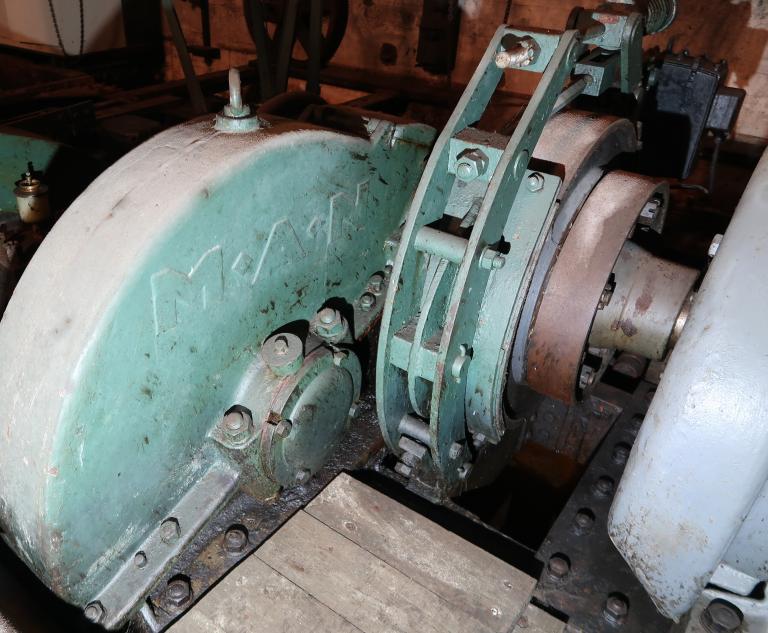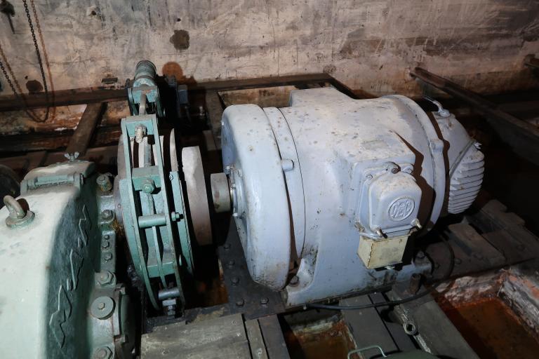 Le moteur électrique de 220 ch. des Ateliers de constructions électriques de Charleroi – ACEC (mais est-ce bien le moteur électrique d’origine ?), alimenté en triphasé, tourne à une vitesse de 715 tours/min (données techniques de 1945). Il entraîne l’arbre moteur avec un pignon à son extrémité (roue de 228 mm, à 38 dents). Cet arbre peut être ralenti voire stoppé par un frein à lame dit à tambour.