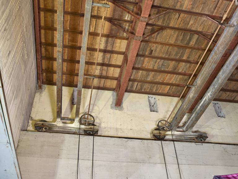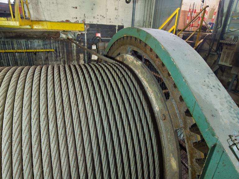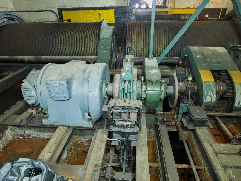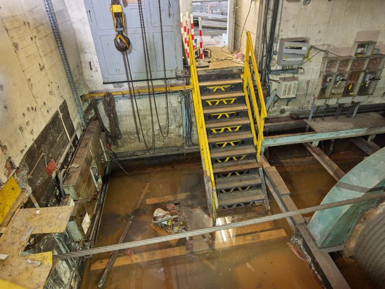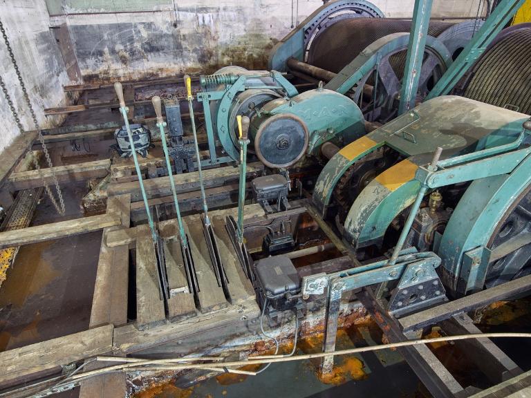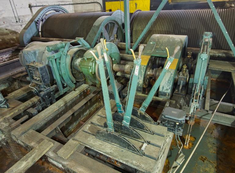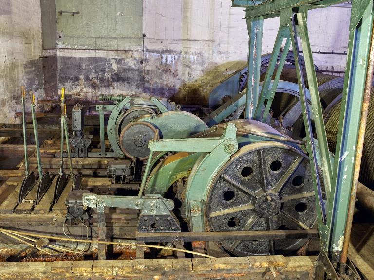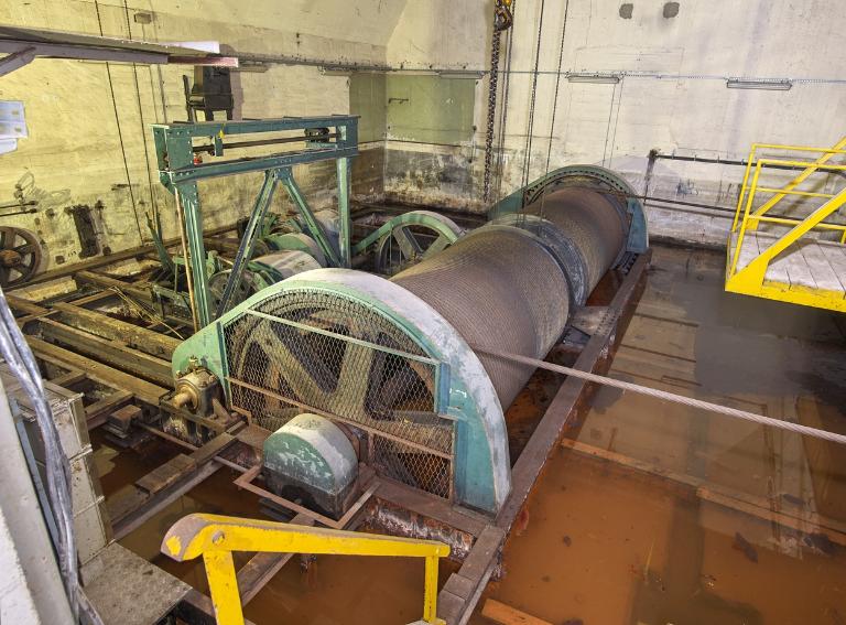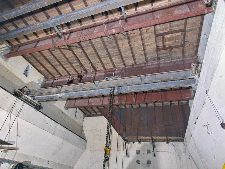 Le platelage en bois a été en grande partie démonté : l’évolution autour des différents organes du treuil se fait désormais sur les poutrelles métalliques ou les quelques planches de bois subsistantes du platelage.