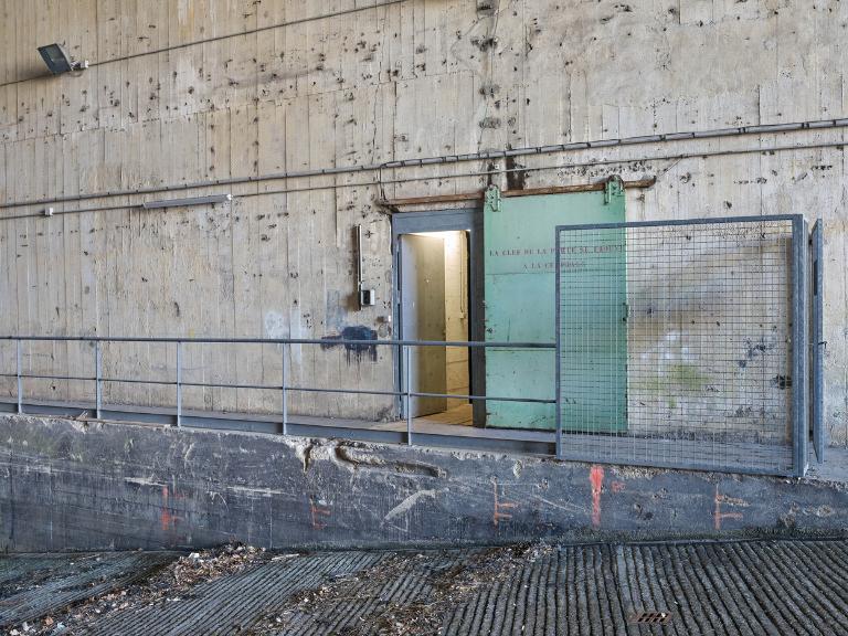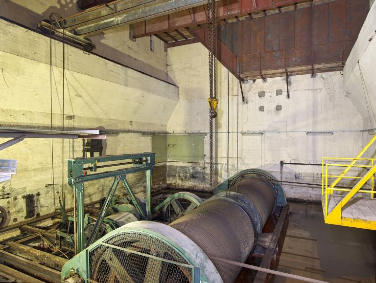 Afin de permettre l’installation et la manutention des organes du treuil, la salle est dotée de deux ponts roulants manuels à chaîne. Des pièces de rechange et des outils sont encore fixés au mur Est côté slipway : roue dentée, clés et cric manuel. A côté, un équipement fixé sur le mur - reconnaissable à sa bouche de soufflage - permettait la ventilation de la pièce. Juste en-dessous, un extincteur est resté accroché au mur.