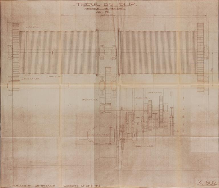 Le treuil de hissage du chariot du slipway est installé dans une salle dédiée situé immédiatement à l’ouest de l’alvéole du slipway dans le bunker Keroman I (à l’extrémité nord, du côté de la porte blindée et de l’aire de translation). Cette salle est dotée de deux accès : le premier, depuis l’alvéole du slipway, est doté de deux portes coulissantes en bois ; le second, depuis "l’atelier de chaudronnerie" (ensuite magasin puis, atelier du Port de La Base de Lorient) est doté d’une double porte donnant accès à une plate-forme dominant la salle du treuil. Ce dernier accès a été modifié après 1945.
